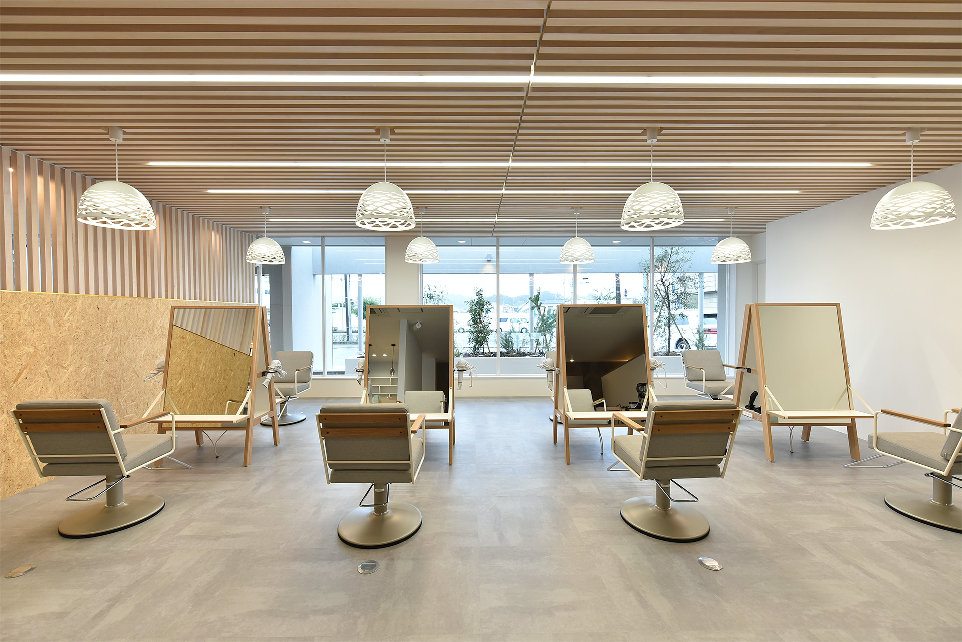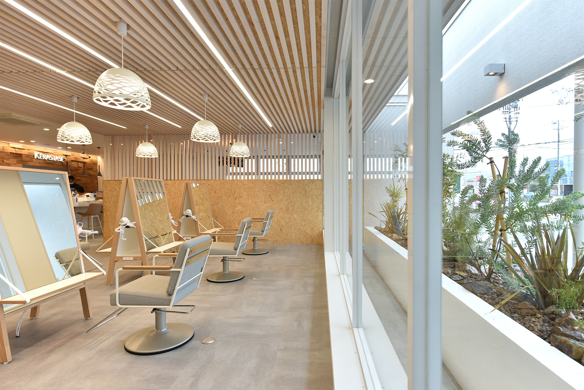 外のグリーンもインテリアの一部。施術中に鏡に映って癒やされます。