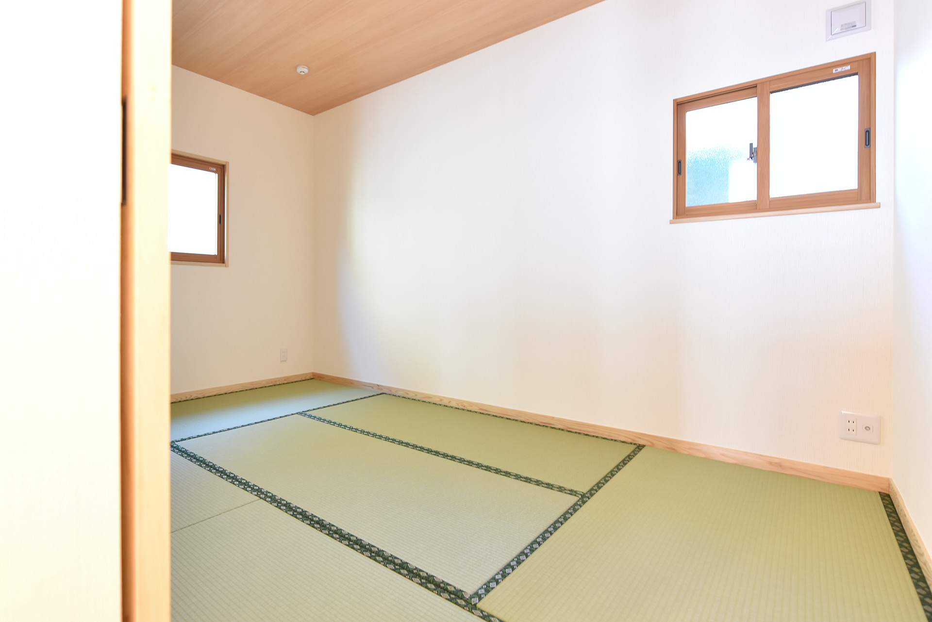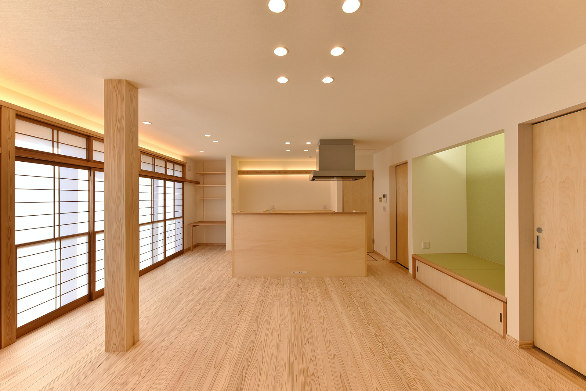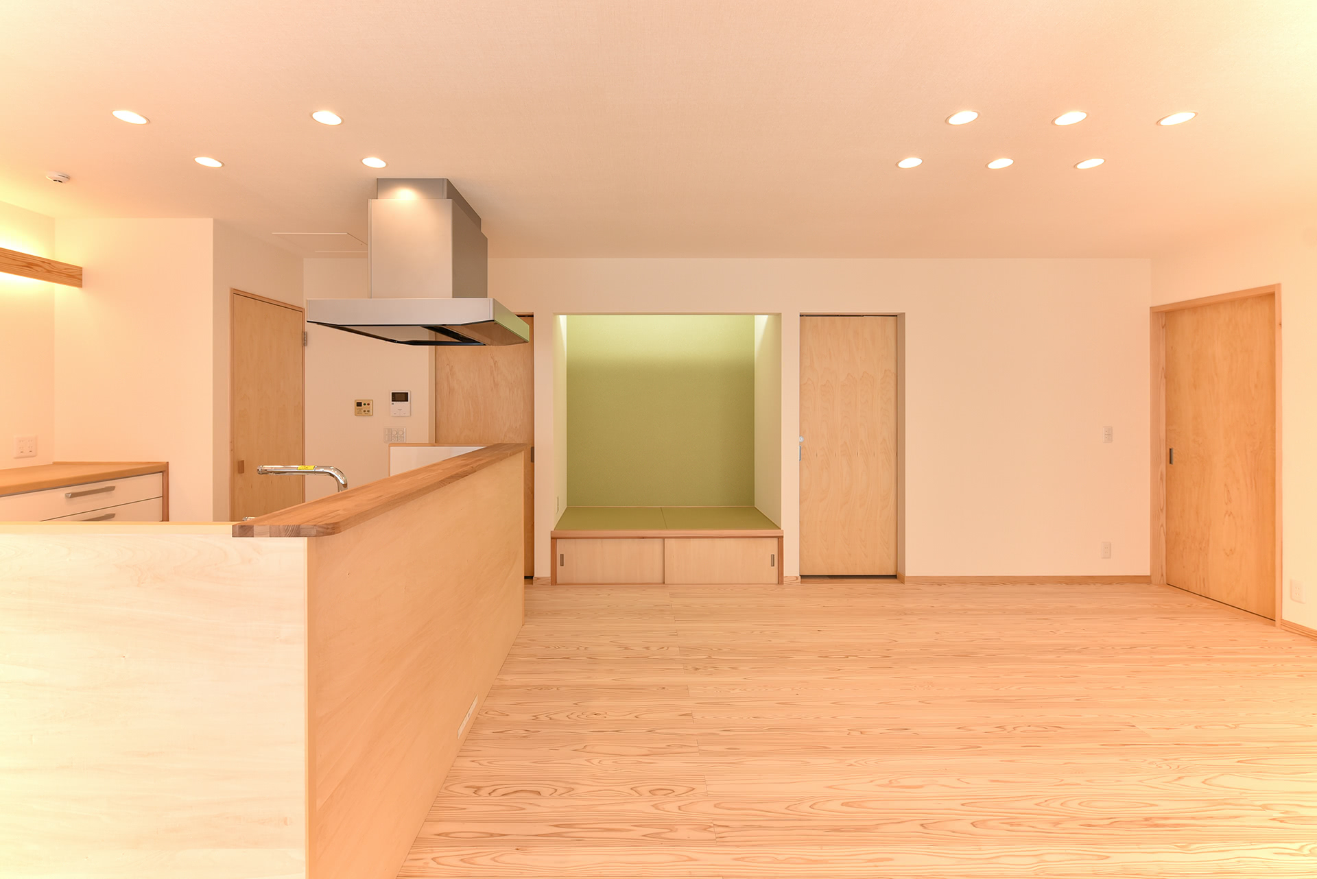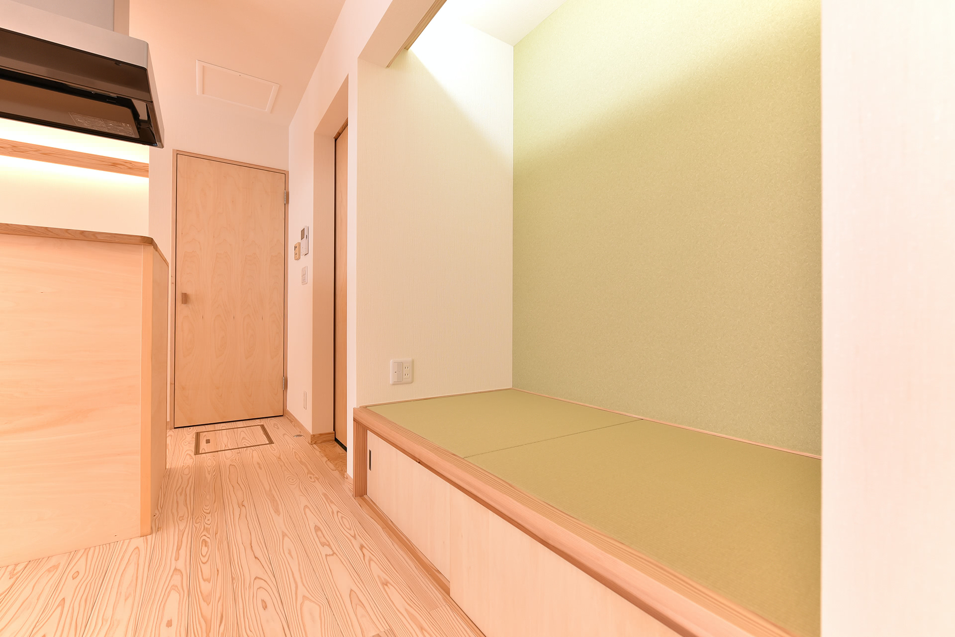 障子の向かい側の薄緑のスペースは、押入れ部分を再活用した畳の小上がりです。遊び場になったりソファーになったり多目的に使えそうです。