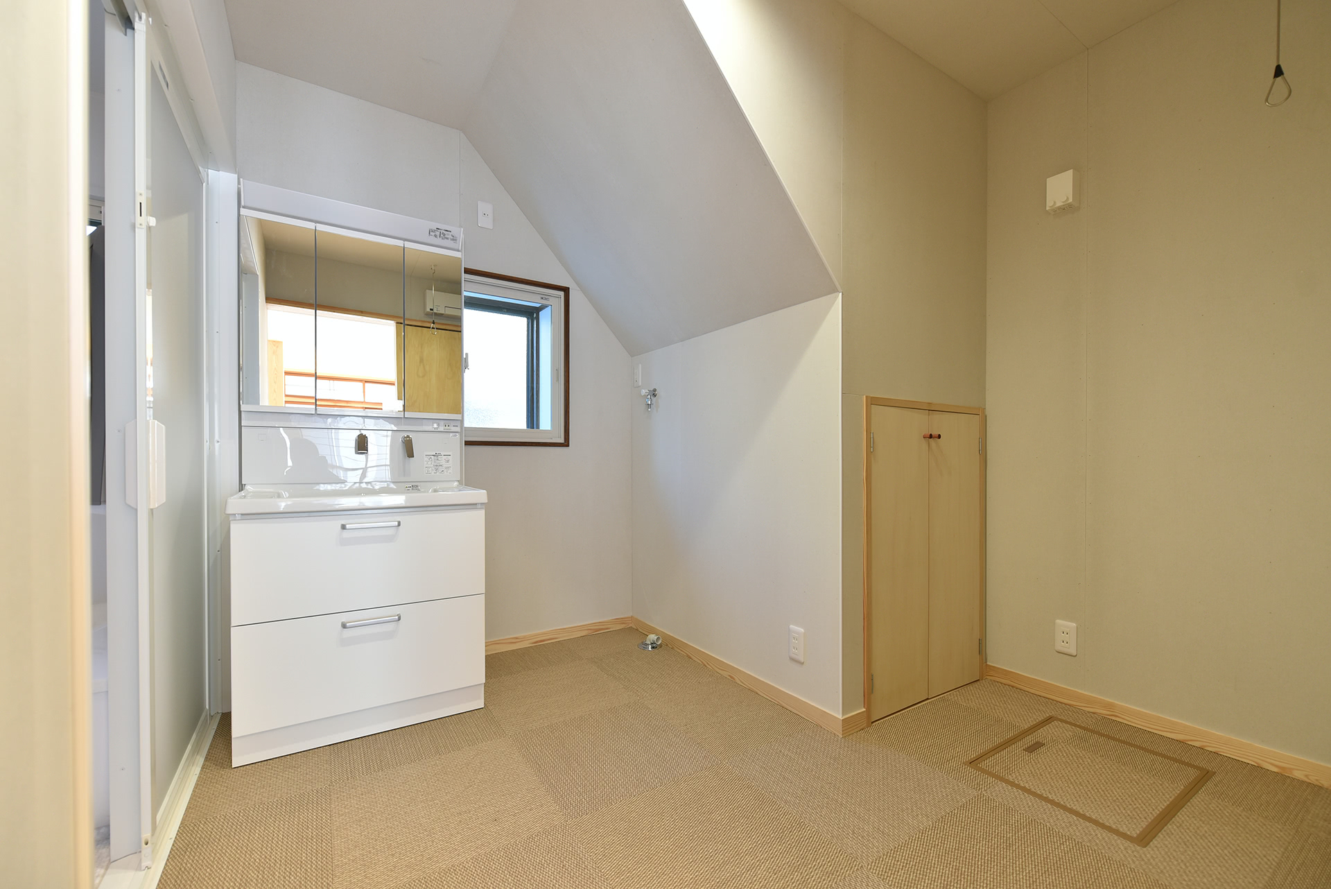 洗濯室を兼ねる広めの洗面脱衣室。こちらも今回の断熱リフォームエリア内。床材は質感、耐久性、メンテを考えてボロン(ビニル製の織物床シート)を採用。
