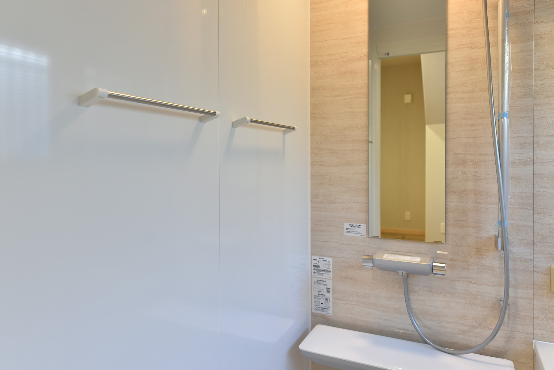 お風呂収納は「置かずに浮かす」。バーを設置して吊り下げることで日々のお掃除を楽に。
