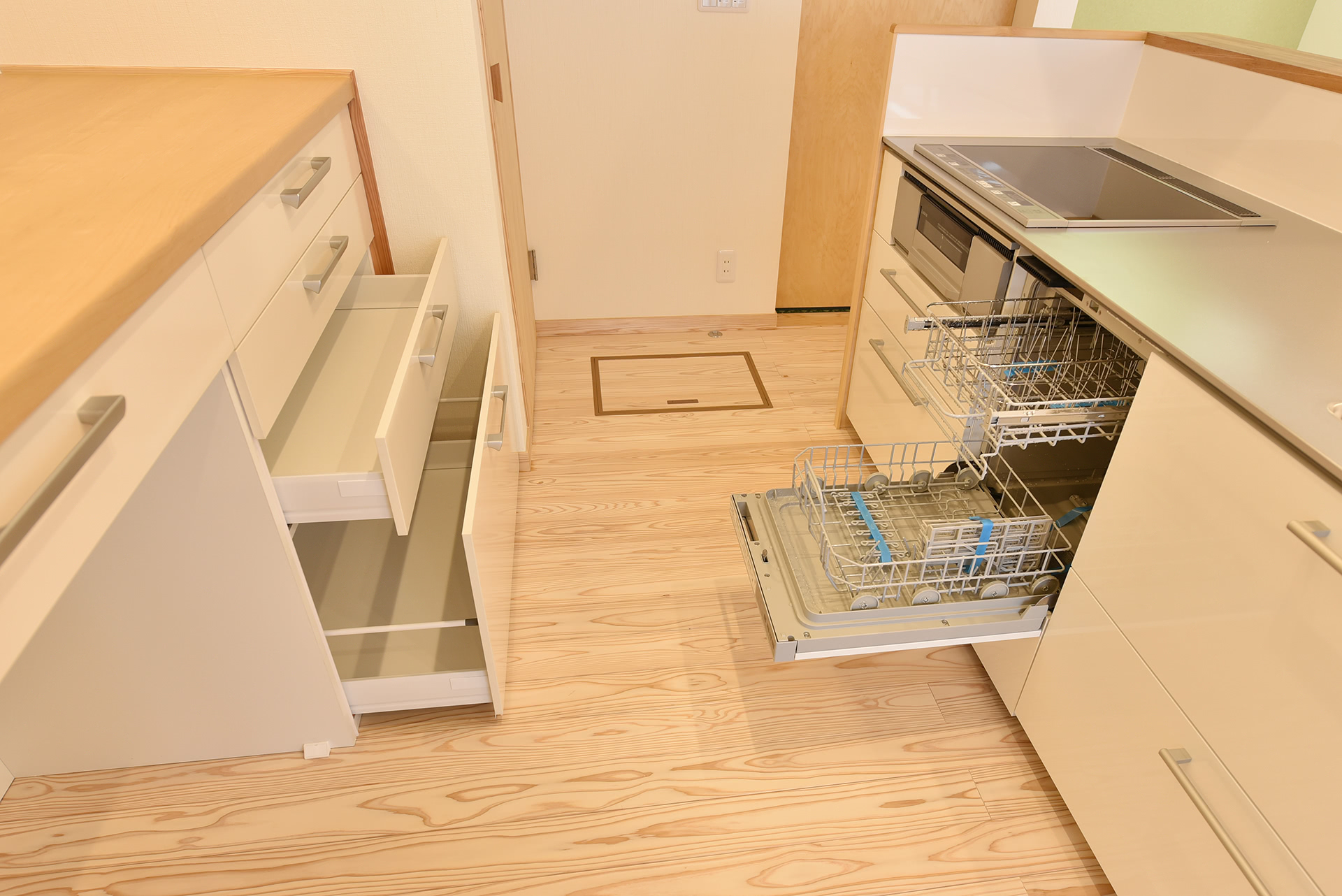 食洗機から食器棚まで最短ルートで片付け。作業台の高さも作業しやすいように高めに設定。