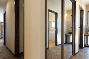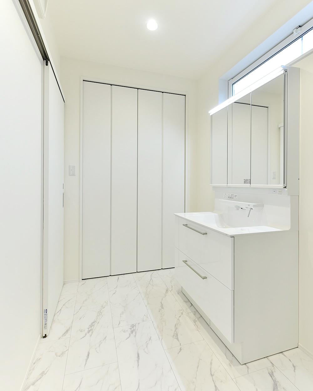 洗面脱衣所にはクローゼット収納を設置して、タオル類だけではなく家族の衣類もしまいます。