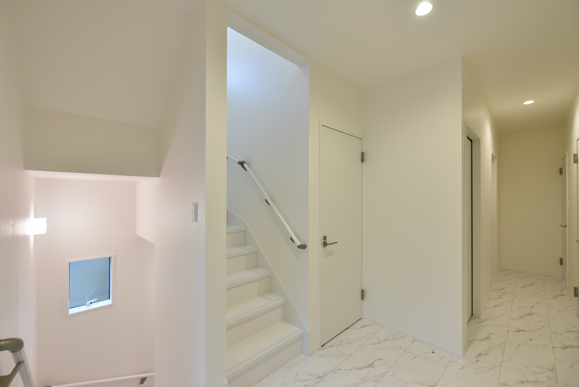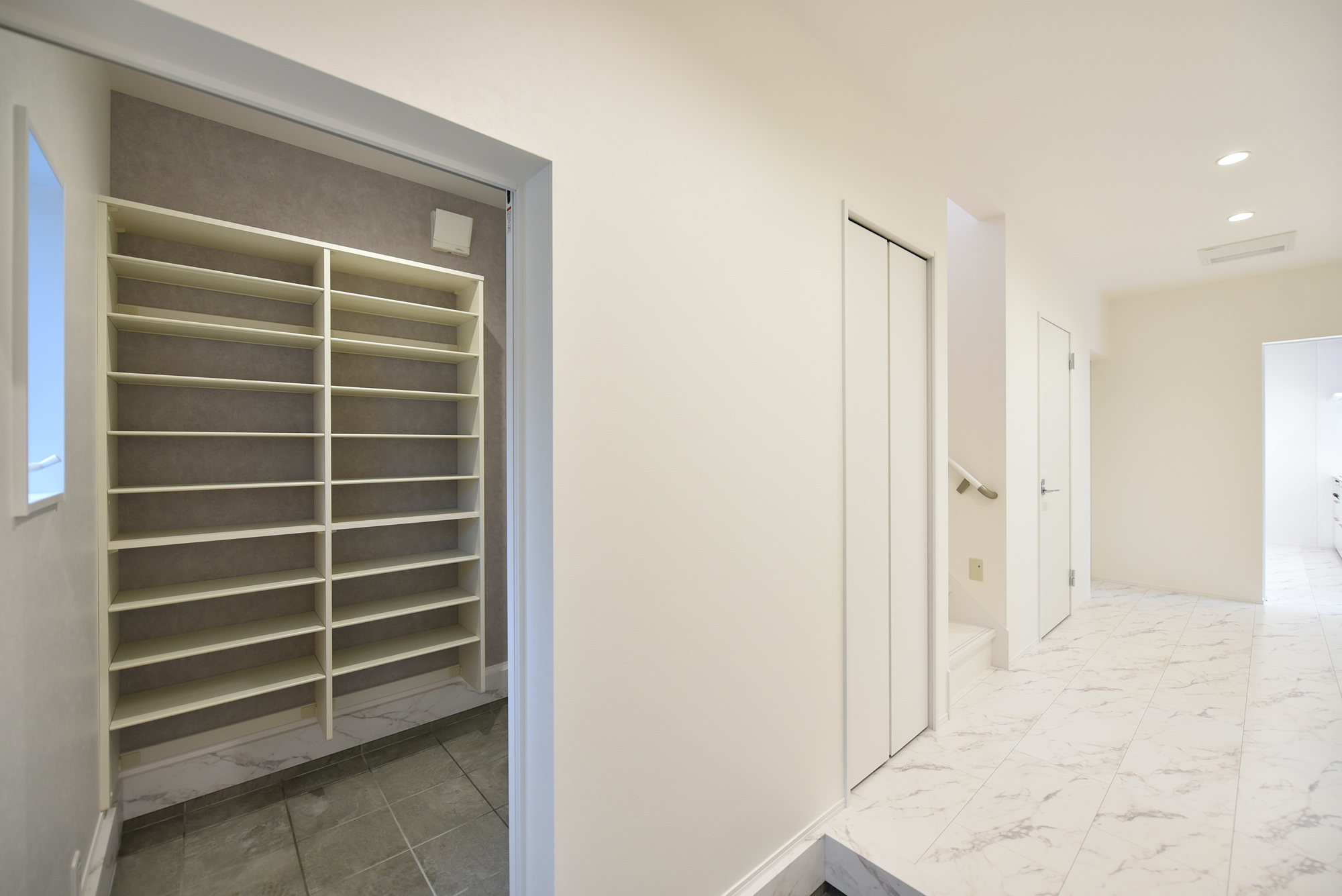 床タイルと巾木のマーブル模様がアクセントになった玄関ホールも余裕を持った広さに。収納も充実していて、シューズクローゼットと上着用のクローゼットが併設されています。