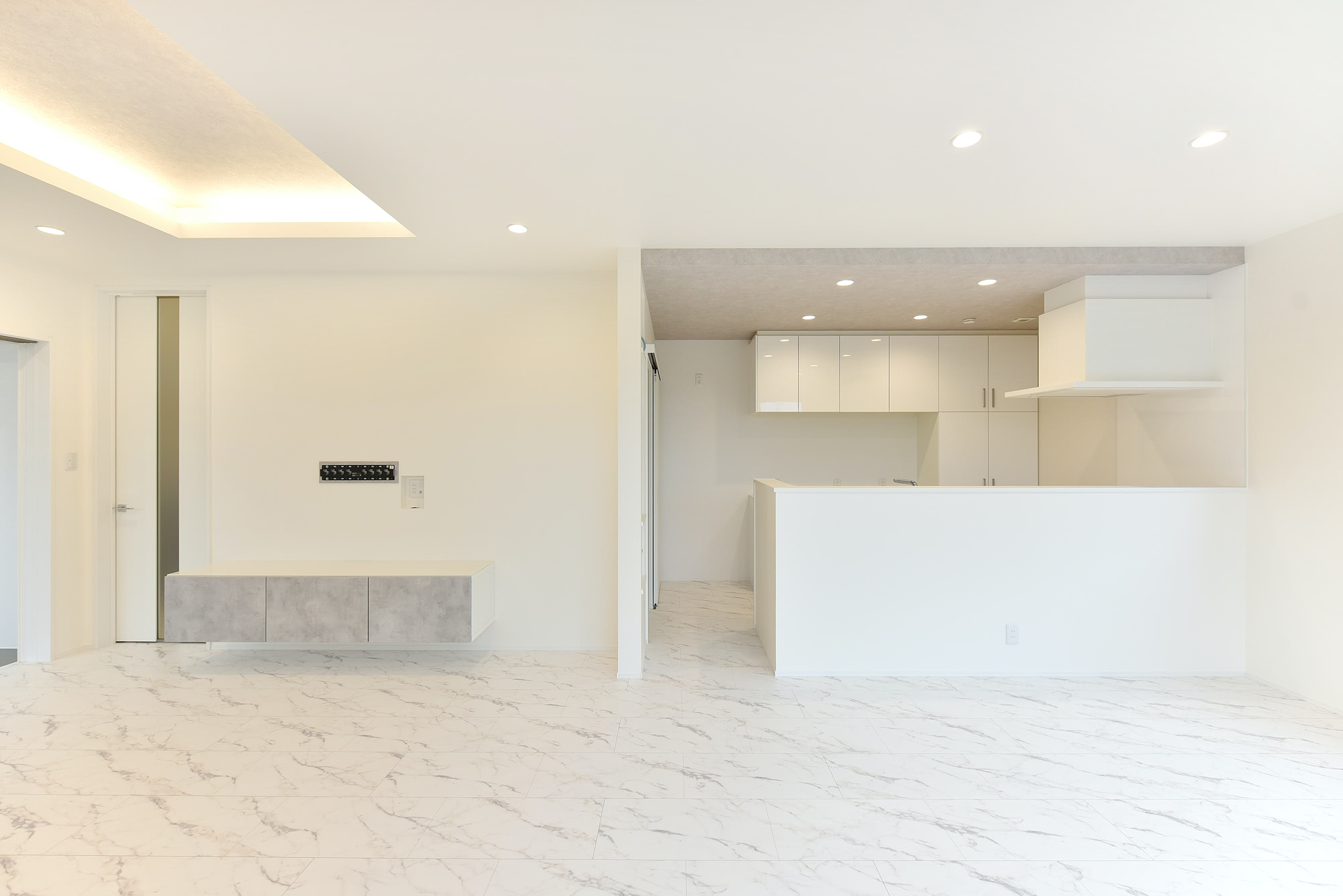 「リビングの天井は間接照明にしたい」というご希望には、折り上げ天井と調色ダウンライトで照明の演色性を高め、雰囲気のある空間に仕上げています。