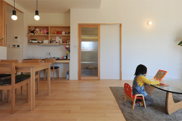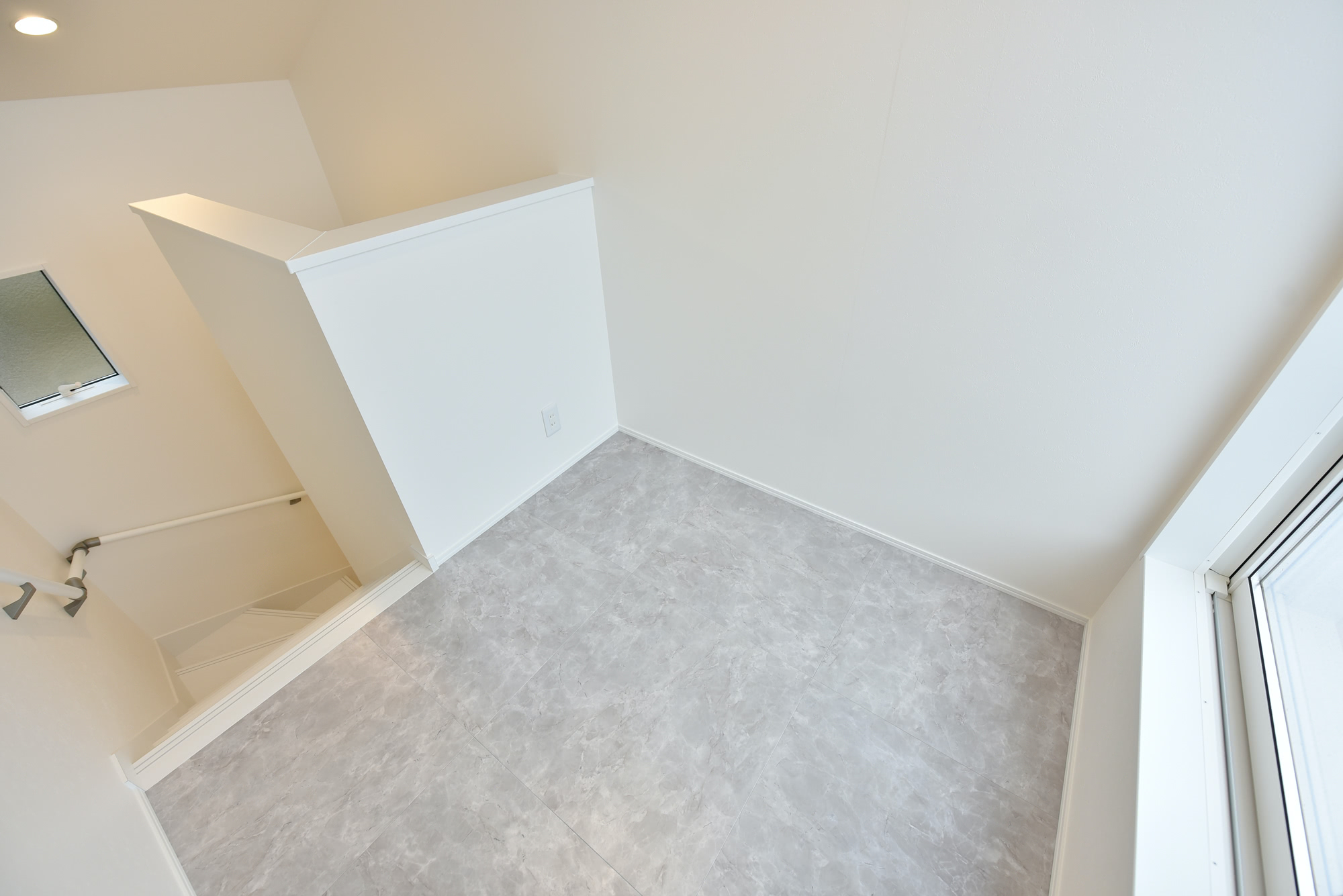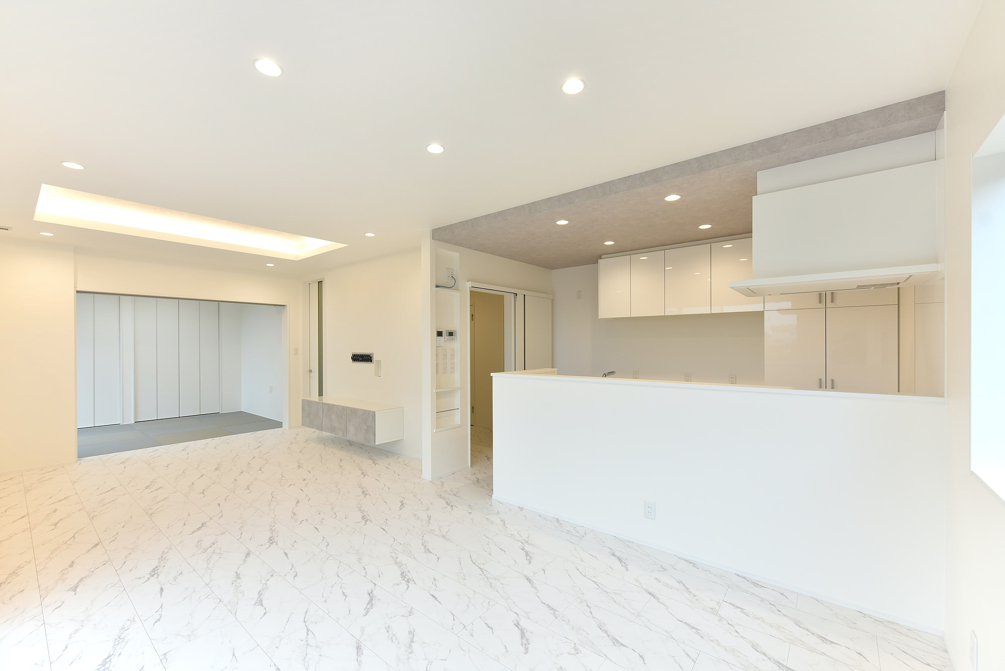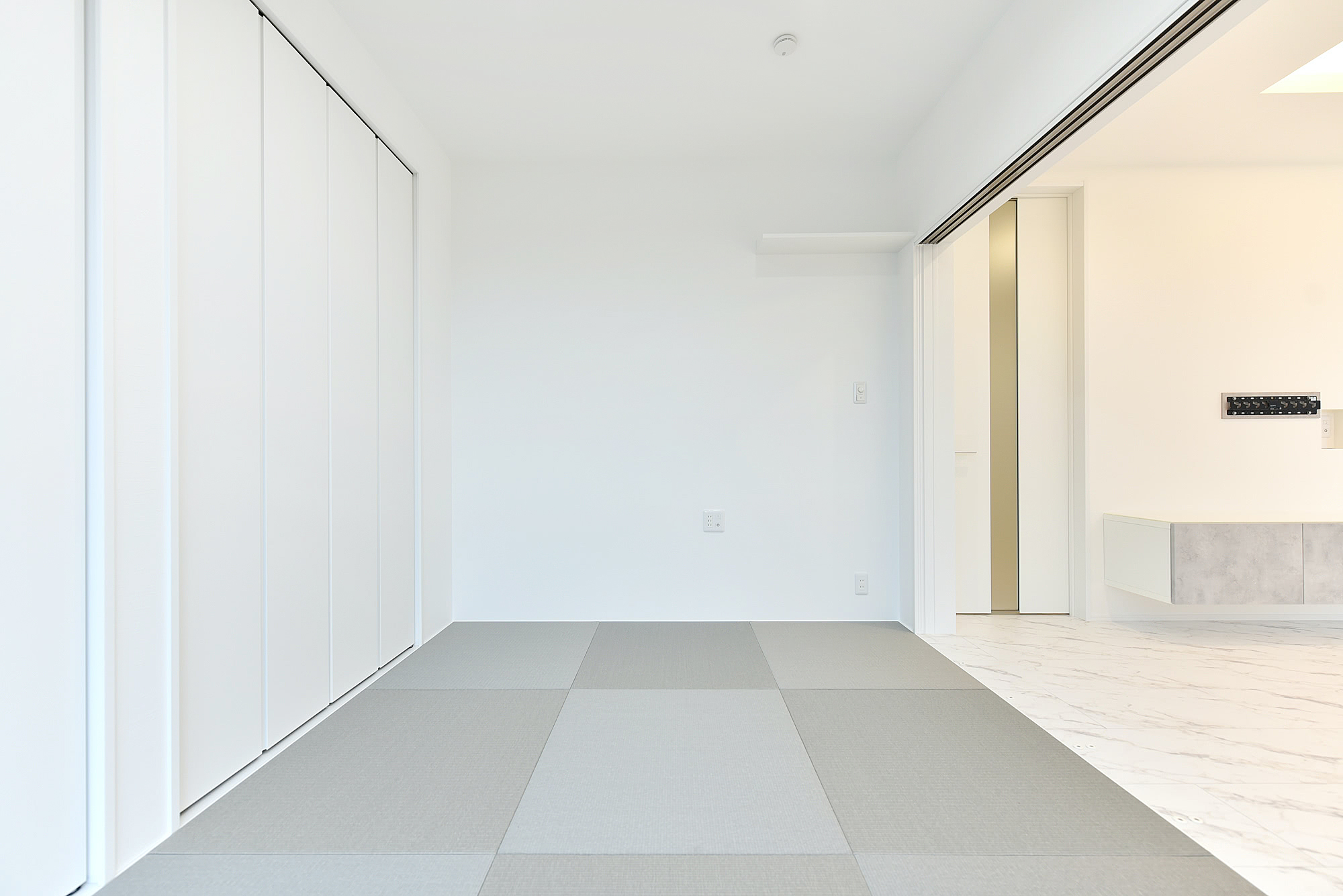 和室ももちろん白とグレーでまとめているのでリビングとの繋がりも◎。24畳のLDKと一体化すると約30畳の大スペースになります。