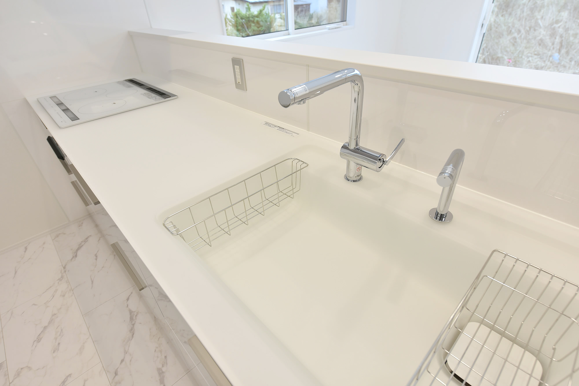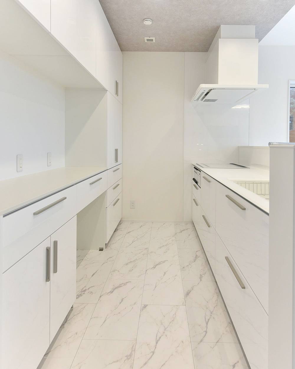 白いシステムキッチンが眩しい。白は汚れが目立ちやすいと思いがちですが、色落ちの心配があまりないので掃除しやすく、また1階には汚れをすぐ拭ける機能性クロス(壁紙)を採用しています。