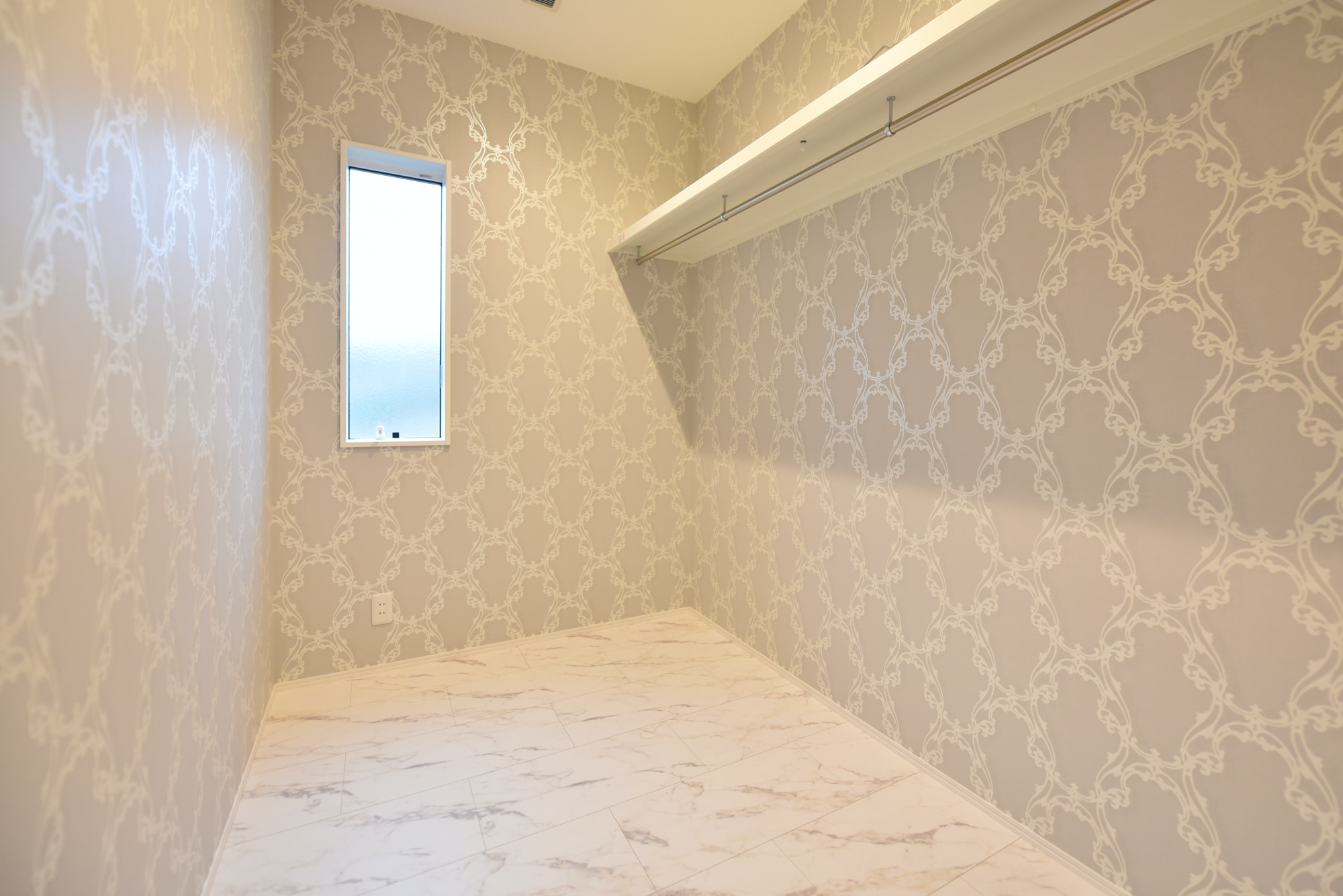 奥様のウォークインクローゼット。2階は各部屋ごとに壁紙を変えて、個性的に仕上げています。