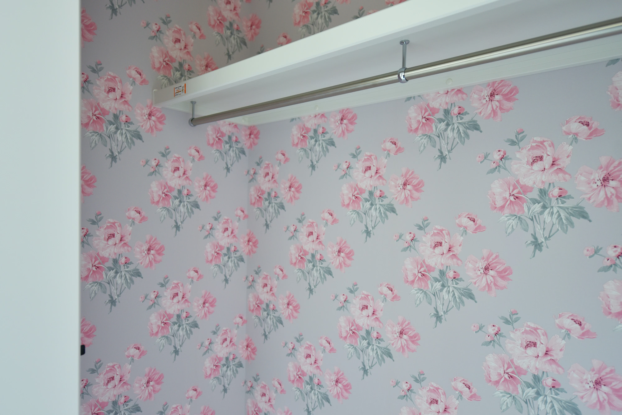 お嬢さんの部屋のクローゼットは可愛らしい花柄。子供部屋はそれぞれ同じ広さになるようにして3部屋設けました。