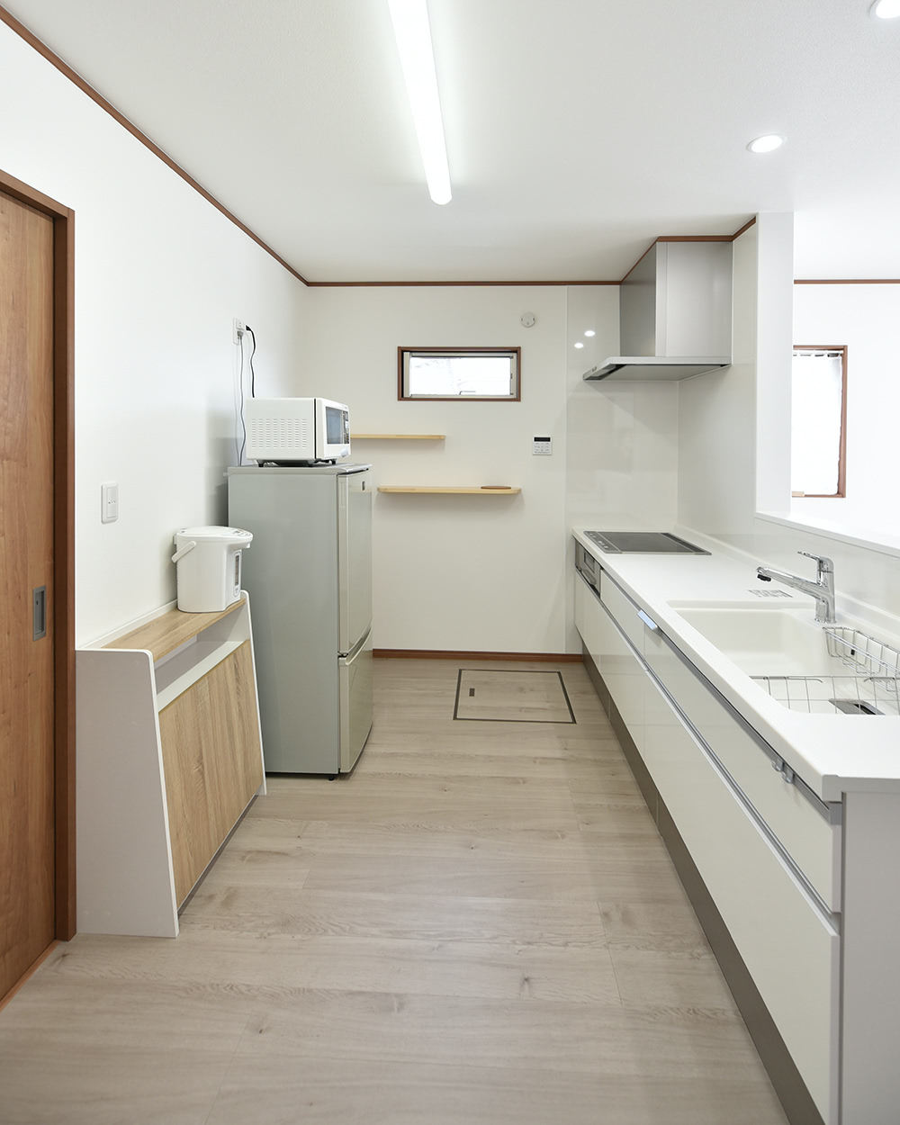 キッチンにも飾り棚と、採光用の高窓をオーダー。収納はキッチン下のスライド収納でほぼ収まるそうです。