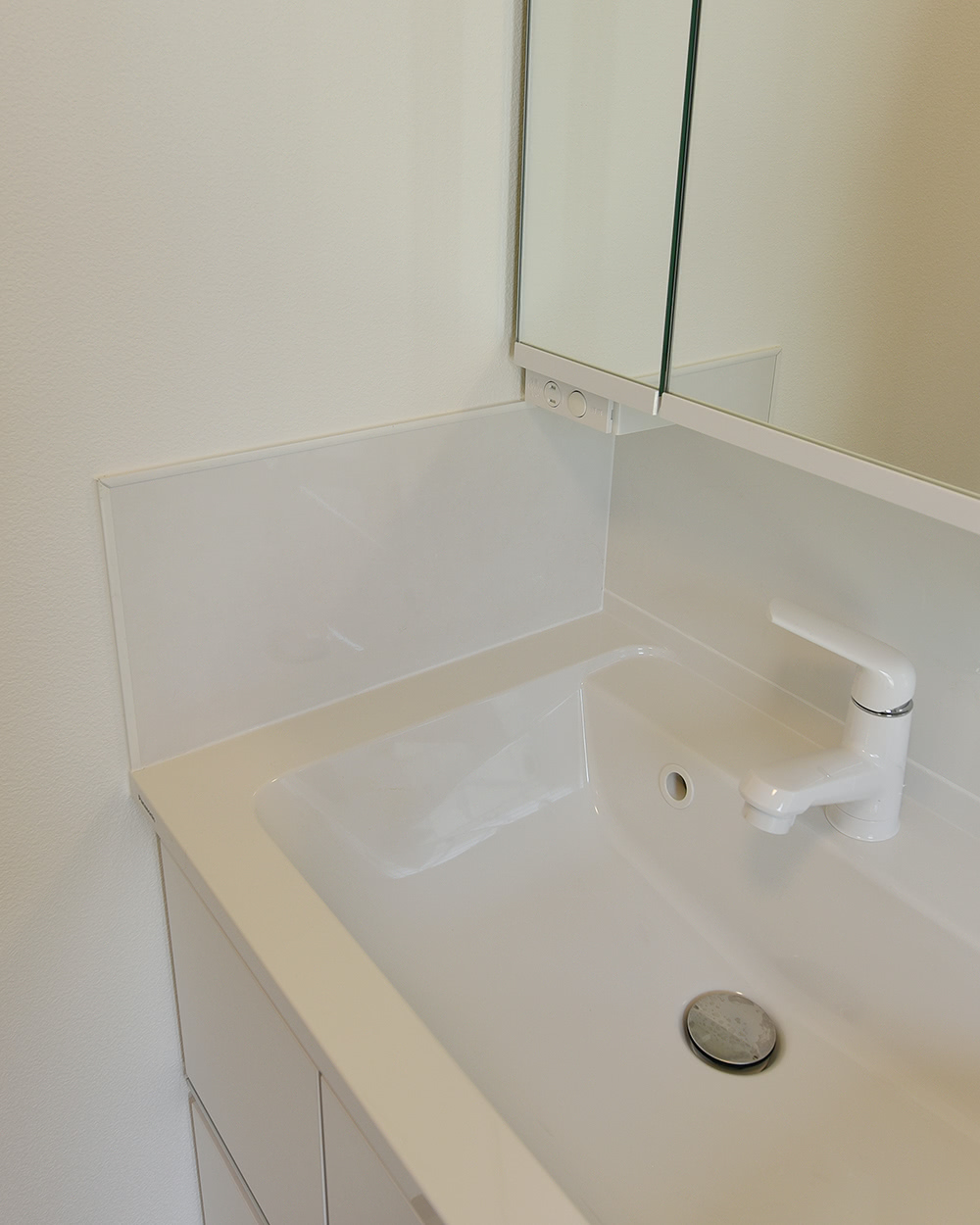 既成の洗面台の横には水汚れを予防するパネルを設置。ちょっとした工夫が嬉しい。