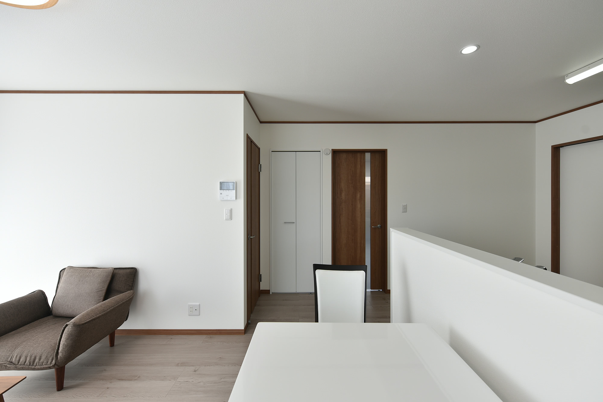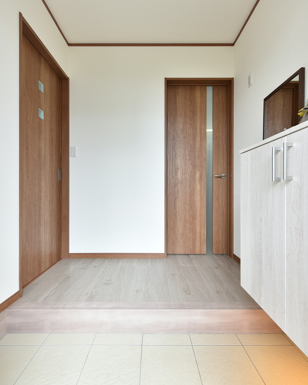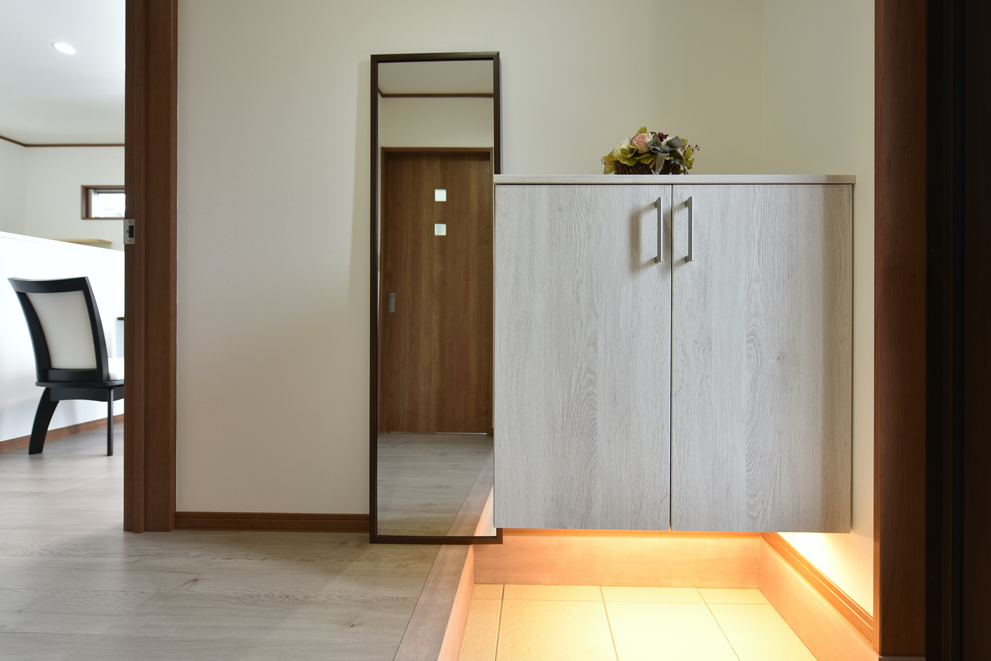「天井と靴箱下の自動センサーが帰宅時に便利で安心です。」と建主様。玄関ドアは網戸付きの採光窓が付いているので施錠したまま通風換気ができます。
