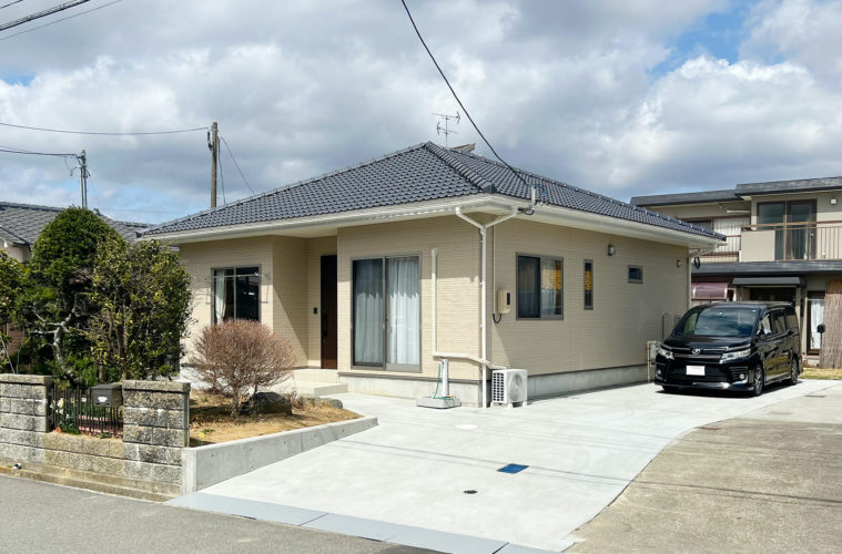 方形屋根と建主様好みのベージュの外壁がシンプル和モダンな外観。玄関を中心に左右対称となるよう設計されています。