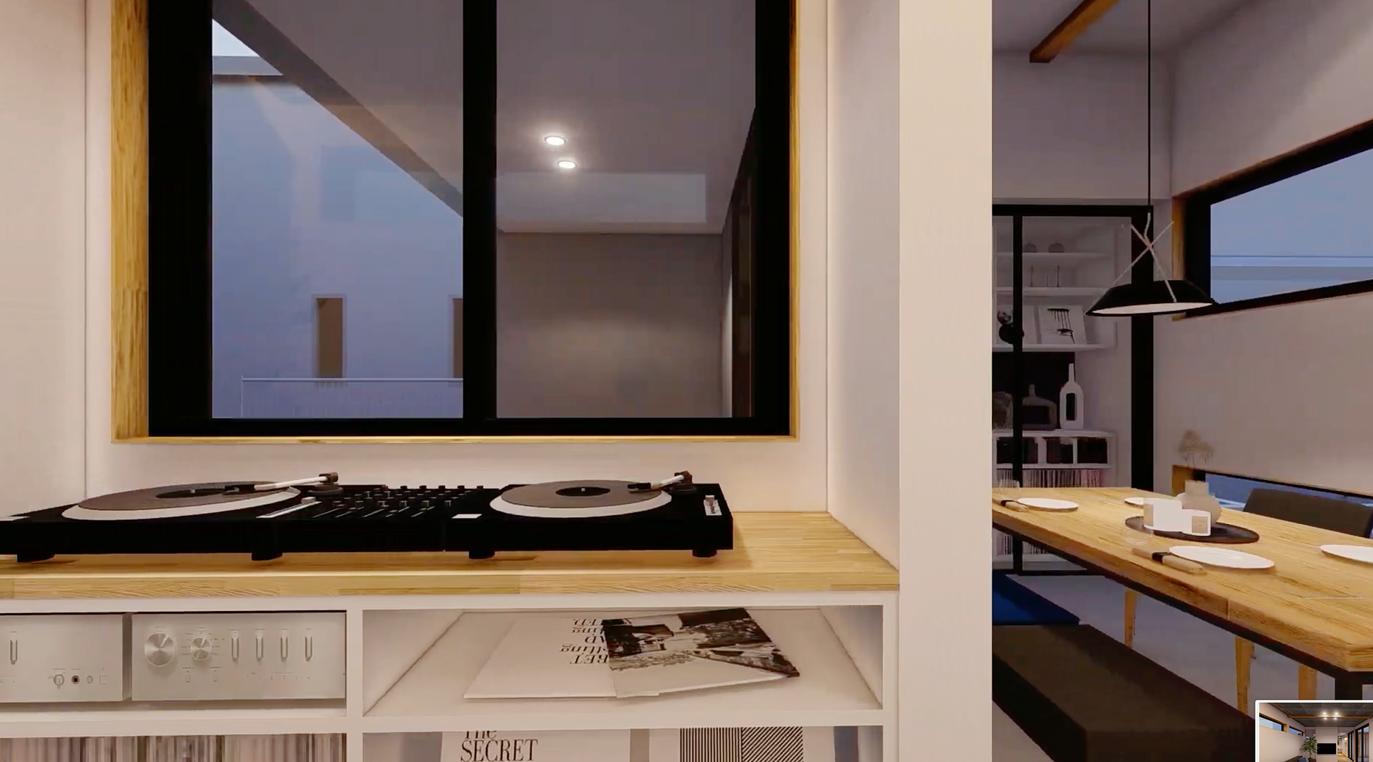 リビングではご主人が趣味のDJで音楽を、キッチンでは奥様とお子様が料理を楽しめる様にプランニング