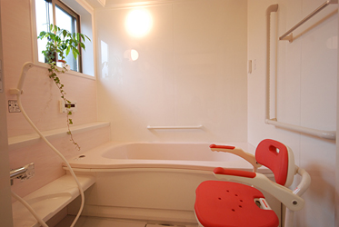 ゆったりと足を伸ばせる広さのお風呂です。入浴中の見守りや介助入浴も行えます(写真右)。