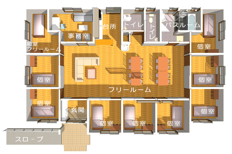 自宅にいるのと同じような気持ちでケアサービスが受けられるように設計しました。
