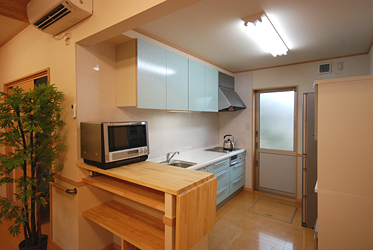 出入りしやすいキッチン。スタッフと協力して料理を行えます(写真右)。
