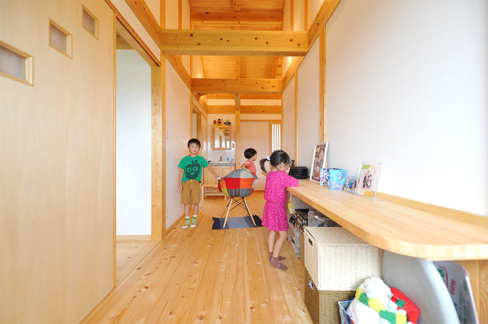 2階に上がるとパッと視界の変化が。子どもたちが空間をより広く使うため天井は作らず、屋根裏の駆体をあらわしにしています。この空間を活用して、子供部屋にはロフトタイプの収納を作りました。こうして空間づかいを工夫することで、2階に3つの子供部屋、主寝室、そして共有スペースを作ることができました。