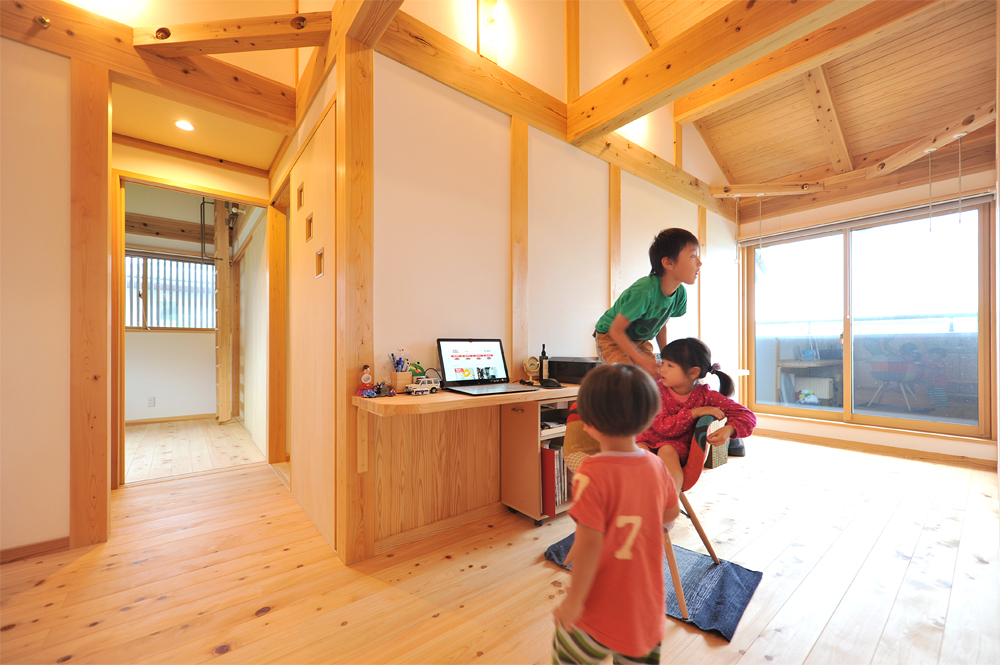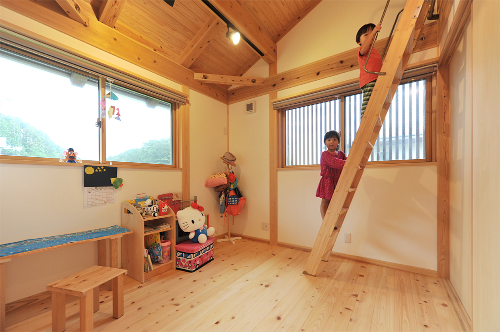 逆側から。子どもを主体に考え、伸びやかさを感じる2階。