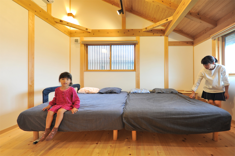 2階主寝室。家族5人がここでみんなで川の字になって寝る。壁は漆喰。結露を防ぎ、調湿性に優れる。