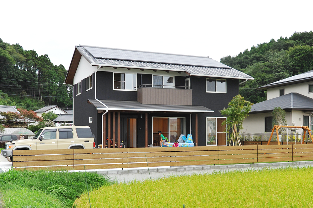 白と木部がアクセントで使われているためか、黒い外壁でも重苦しい印象にならず、すっきりとした印象の外観。長期優良住宅クラスの断熱性能も持ち合わせており、冬でも寒くない。