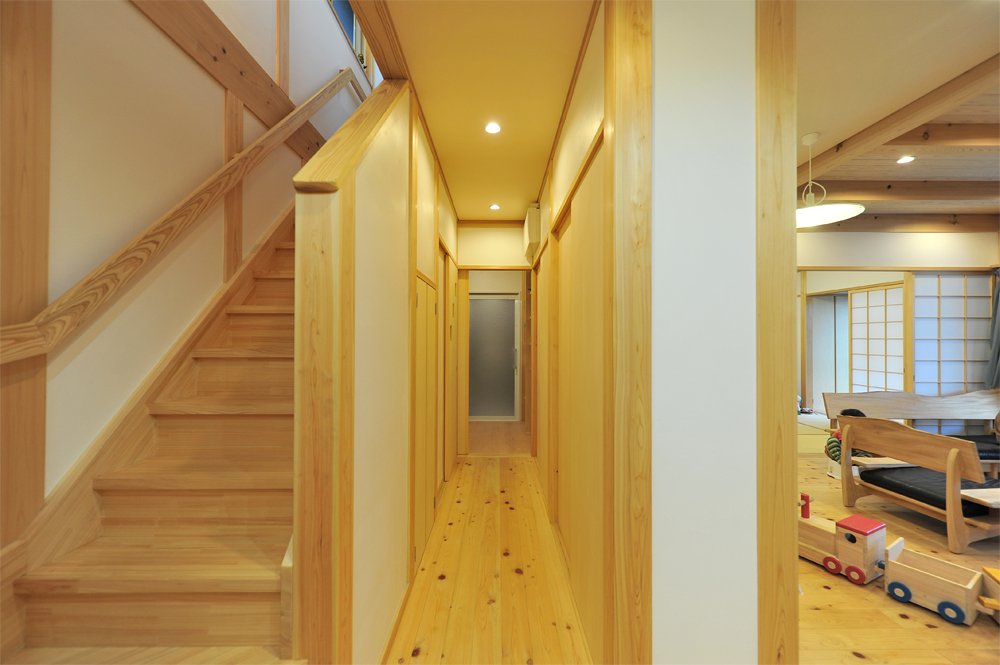 今回の家づくりの主役は、3人のお子さまを持つご夫婦。お母さまも一緒に住むことが可能な「半2世帯住宅」をと、江尻建築さんの門を叩きました。完成したのは、1階と2階の天井高で雰囲気と用途を分けるメリハリのある総二階の家。江尻建築さんの代名詞である自然素材もたっぷり使われ、心地よい自然派のお住まいとなりました。