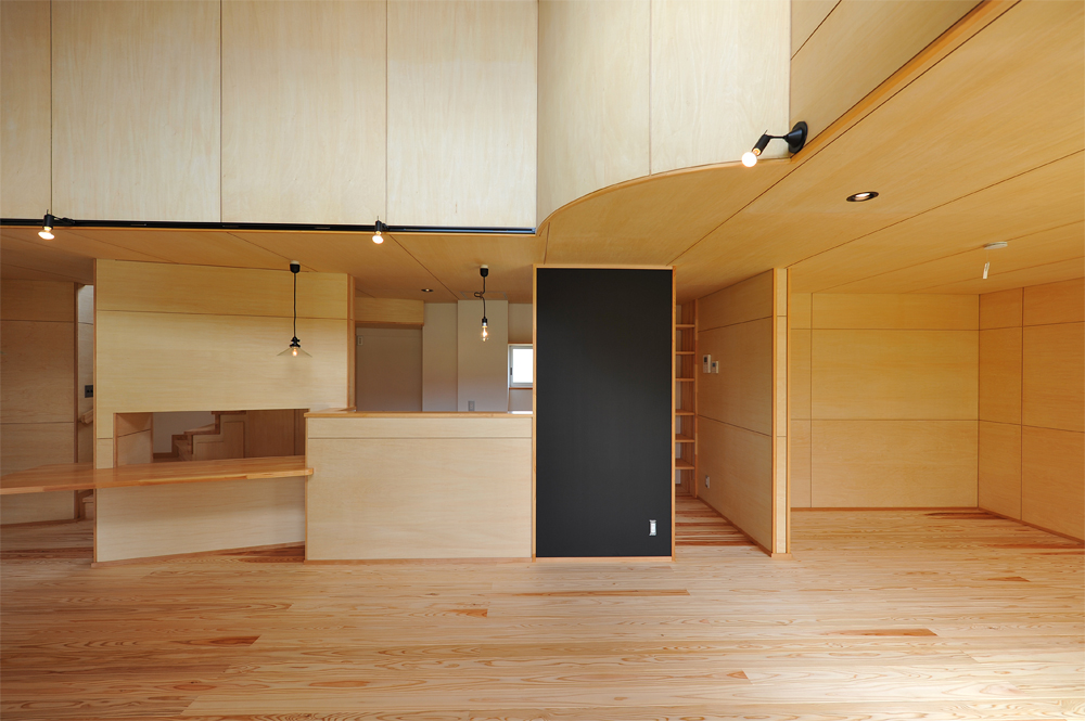 主な内部仕上げ:天井))シナ合板・ワトコオイル 壁)シナ合板・ワトコオイル 床)あつ密すぎ・蜜蝋オイル