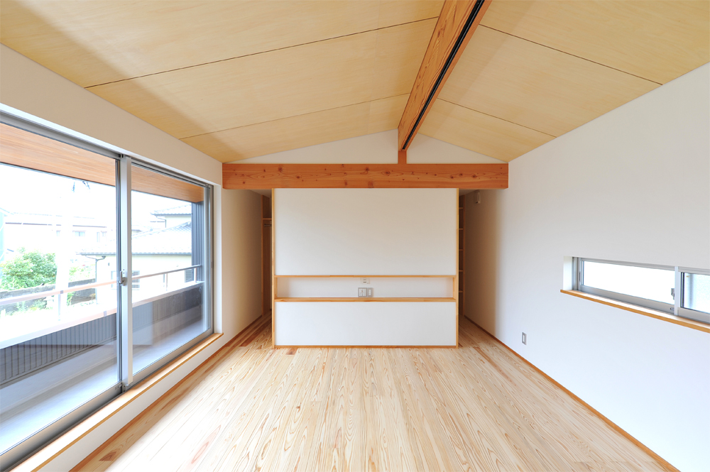 2階寝室。あらわしに使った梁には電気器具が取り付けられます。奥は両側から使えるウォークインクローゼット。