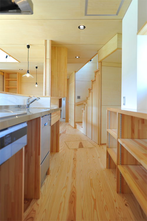 奥様のこだわりはキッチン。ステンレスの流し台のみを別注し、既製品の部材をはめ込んで使うなど、既製品と造作をうまく組み合わせ、使い勝手のいいキッチンに仕上げました。キッチンがコンパクトな分、階段下など周囲に収納を多めに作ることで対応。夫婦の希望が随所に叶えられた家になっています。