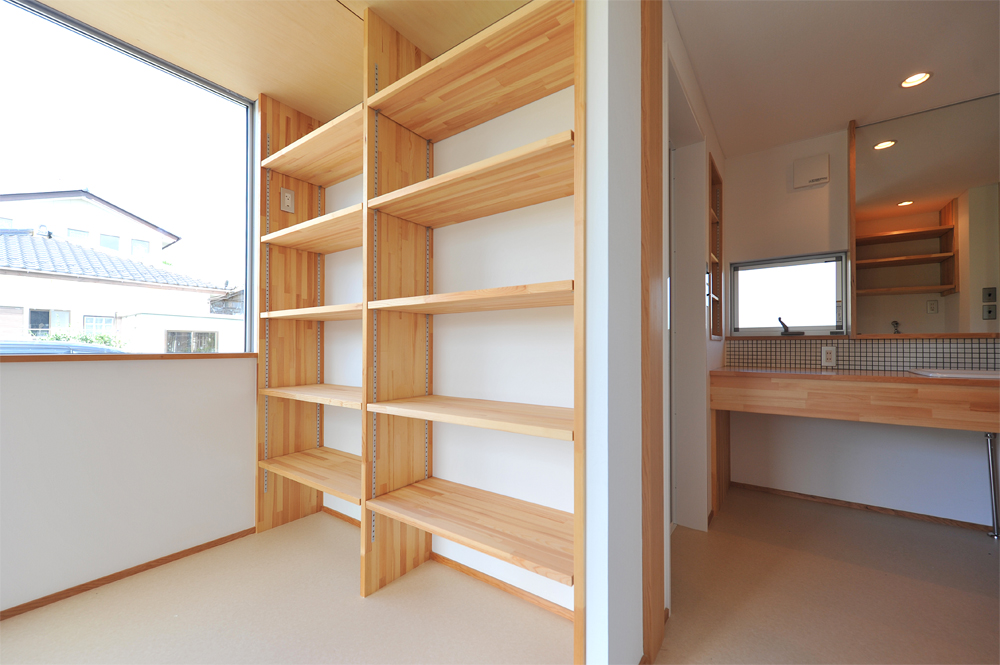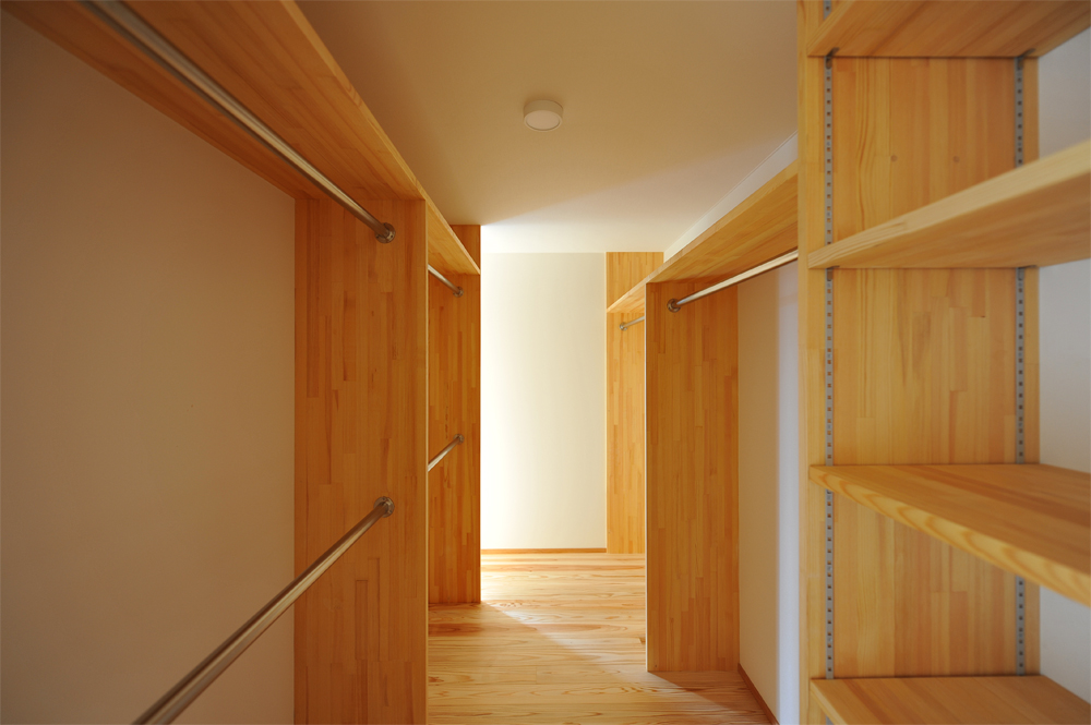 寝室のウォークインクローゼット。収納はすべて大工さんの造作によるもの。シンプルで大容量。