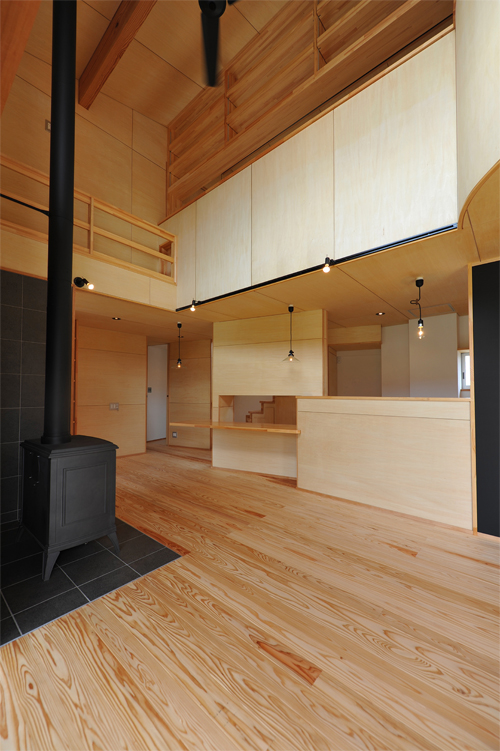 そんな依頼を受けたKD設計の佐藤大さん。薪ストーブに映えるようにと、天井や壁には白色系のシナ合板を、そのままあらわしで使用。所々に使われた純白のクロスや、ドア枠など造作に使われているツガ材とのコントラストも美しく、適材適所で温かみのある木質材料を配しています。