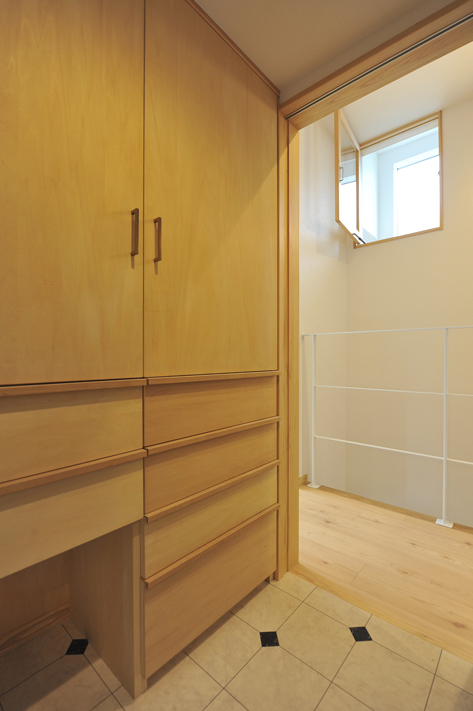 いわき家ナビ 小森工務店 まちなか3階建2世帯住宅2階の和室からつながっている廊下のロフト 。下部は水回りと収納です。夫婦の寝室、子供部屋ともトップライトを設け明るく空気が流れるようにしました。