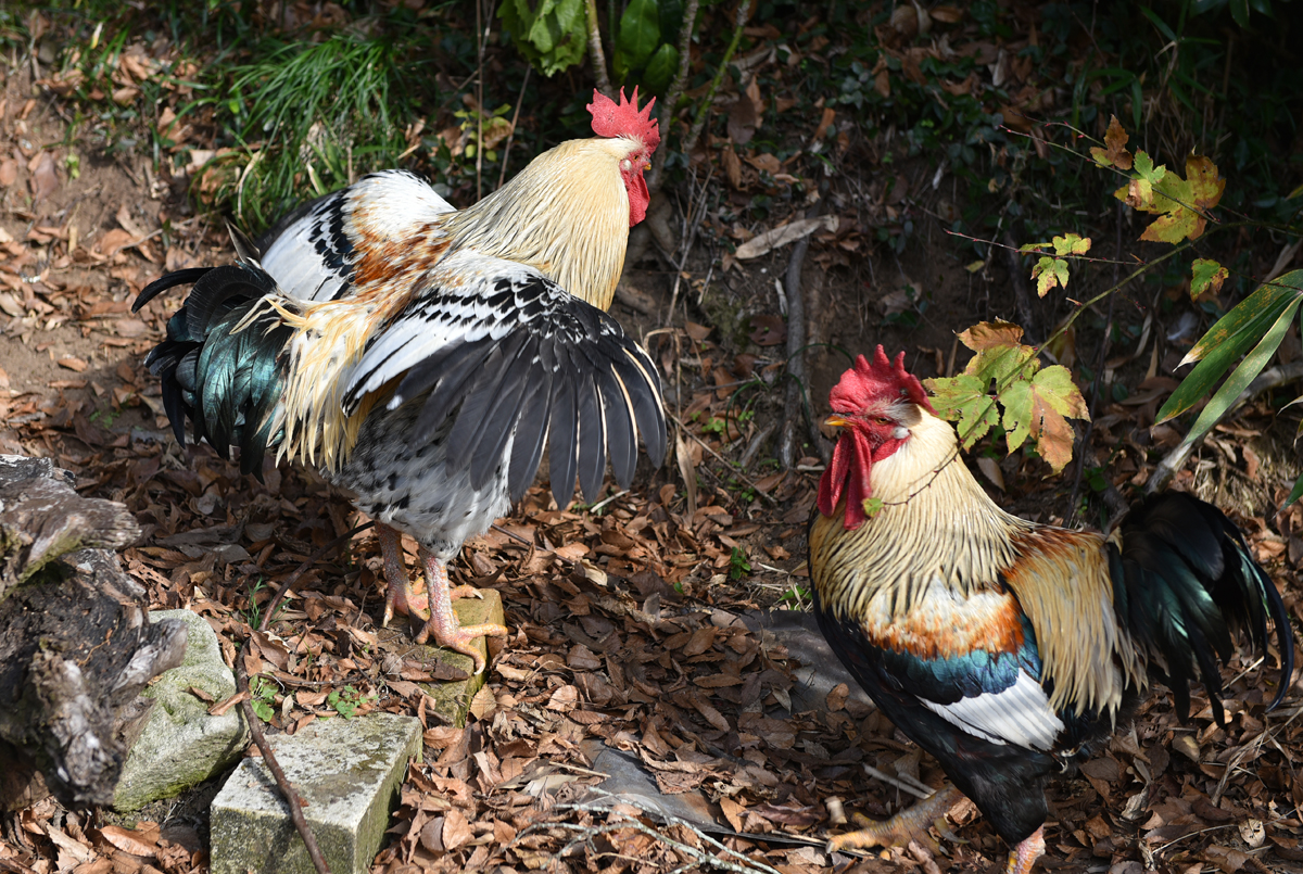 余談:境内で祭事用に放し飼い(!)にされていた会津地鶏。こちらの尻尾の色も綺麗な緑錆色でした。