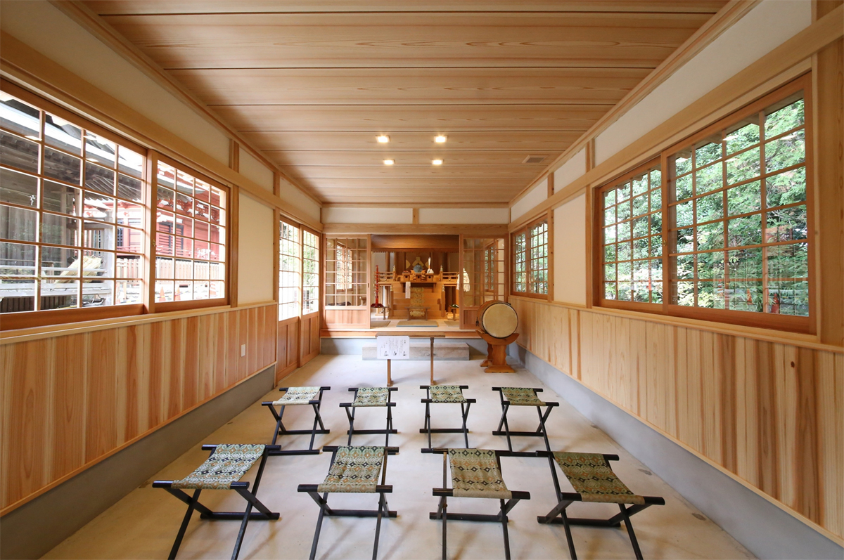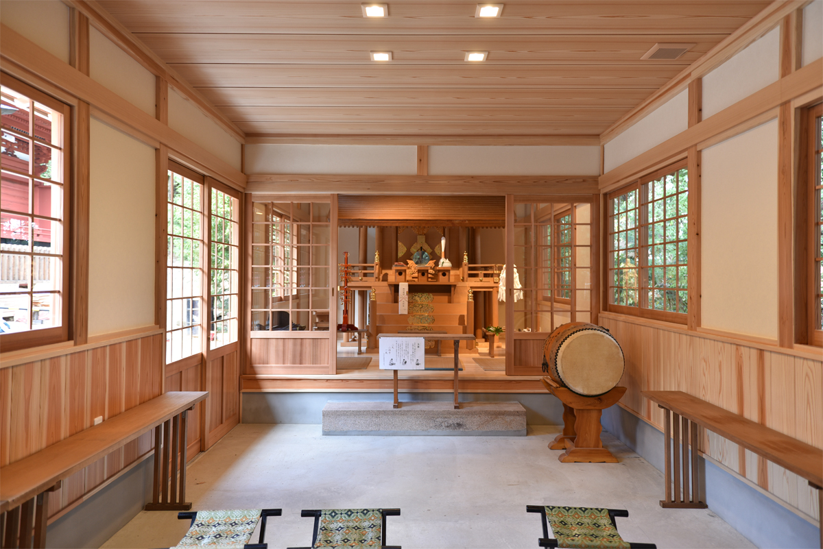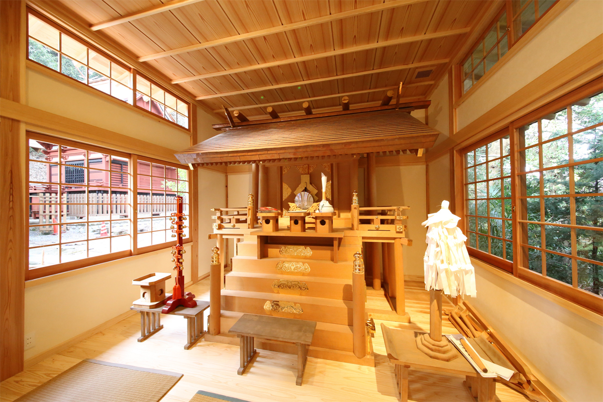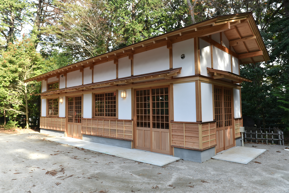 建物の外観は拝殿や本殿、神楽殿とも調和するよう、真壁で庇を大きく出した和のつくりをしています。屋根は銅板ぶきで将来的には他の建物と同じような緑色になる予定です。外壁は漆喰壁と杉板壁。内壁は竹の練り込まれた和紙と杉板張り、板の間はあつ密杉を使用。将来的には主に倉庫や待合等として使用されますが、すべて自然素材で仕上げ、鎮守の森に静かに調和する仮殿となりました。36鎮守の森の本殿横に建築。e1