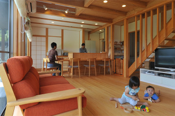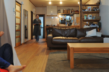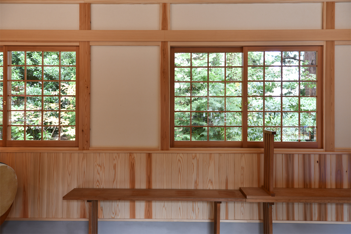 35杉の窓枠のせいでしょうか、内部はどことなく昔の小学校の木の校舎のような懐かしさが感じられました。この建物の建具は、以前神社の境内で伐採した杉を板にして守和住建で保管していたものを利用しています。