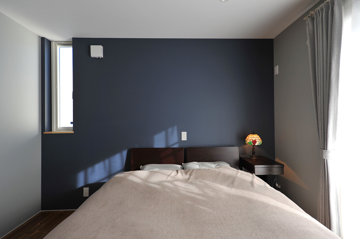 132階主寝室。ブルーとグレーのグラデーションで落ち着いた雰囲気になっています。