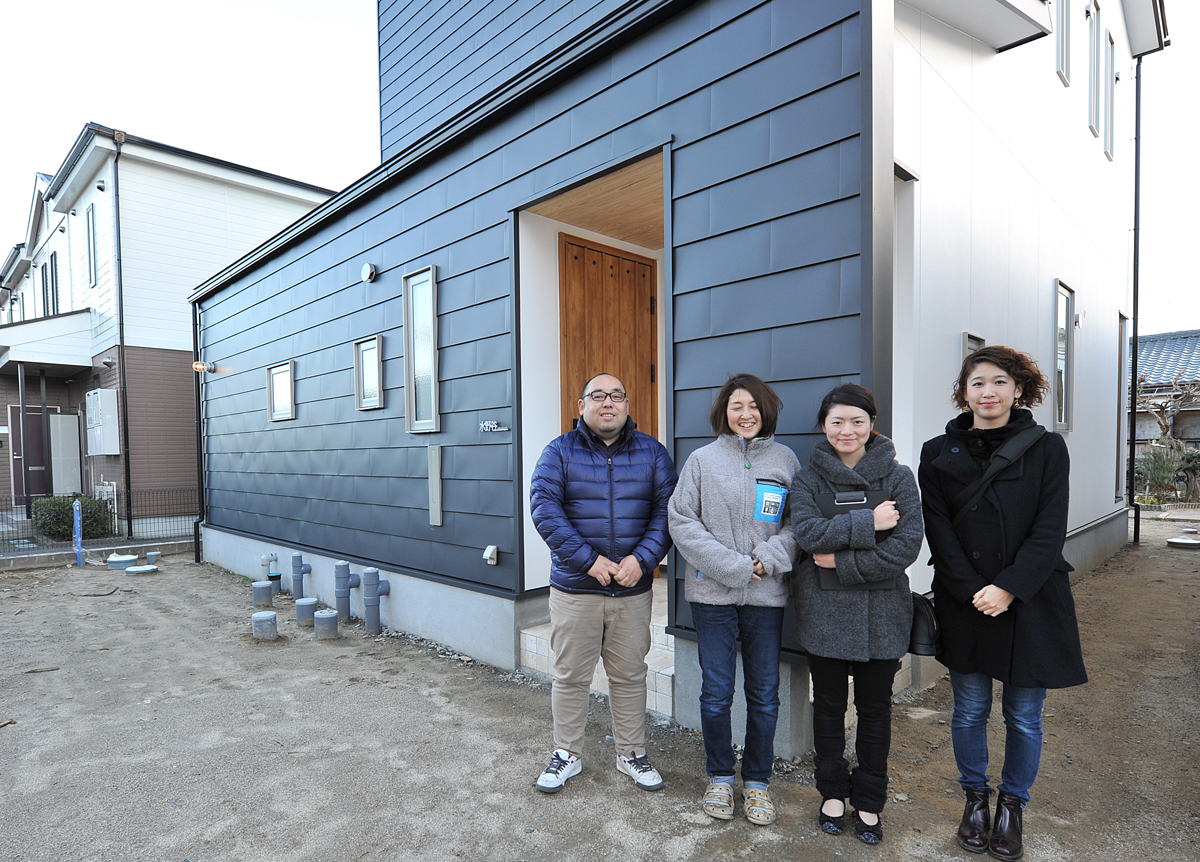 14外壁にはガルバリウム鋼板を横張りに。無機質でスッキリとした縦張りに比べ、横張りは表情が生まれます。設計と施工を担当した後田哲男さん(左)と、お施主の奥さま(左から2番目)。そして後田工務所の女性スタッフ(右側お2人)。女性が活躍しているのも後田工務所さんの特徴です。
