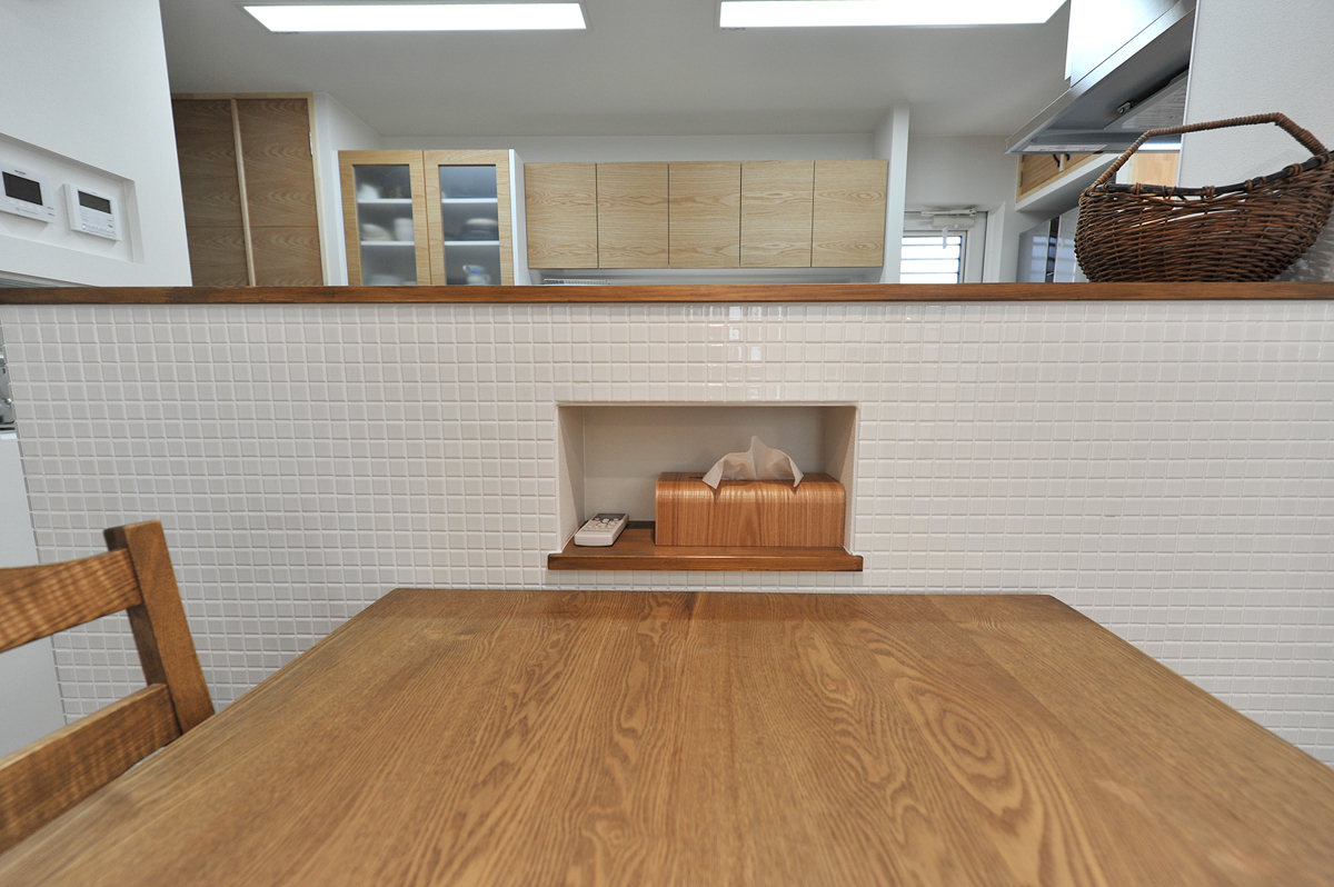 また、壁をくりぬいてつくる収納スペース「ニッチ」の有効活用も巧み。ダイニングテーブル脇、リビングの壁、そしてキッチンと、痒いところに手が届く絶妙な配置。日常的に使うものがテーブルに散乱することを防ぎますし、壁から飛び出ない収納なので見た目にもスッキリしますし、圧迫感はまったくありません。