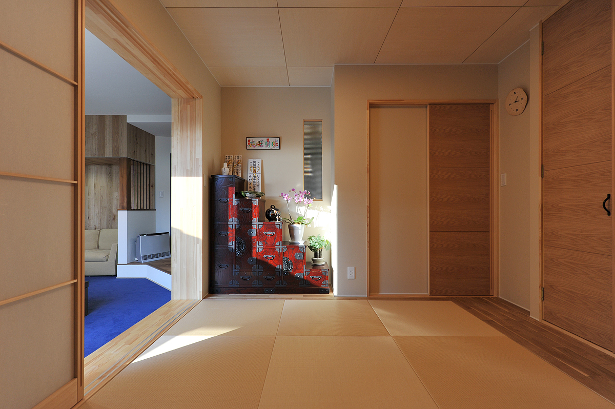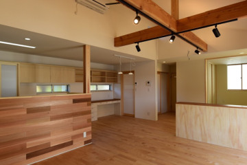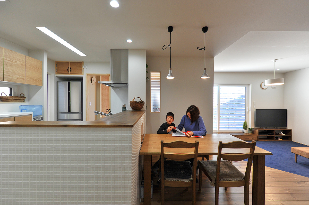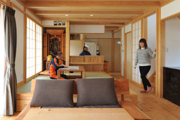 そこで、後田工務所の後田哲男さんが取り入れたのが1階LDKの「回遊動線」。リビング、和室、キッチン、ダイニングスペースを巡るように動線が組み込まれています。行き止まりがないので、人が滞留せず、「帖数」以上に広々と感じることができます。