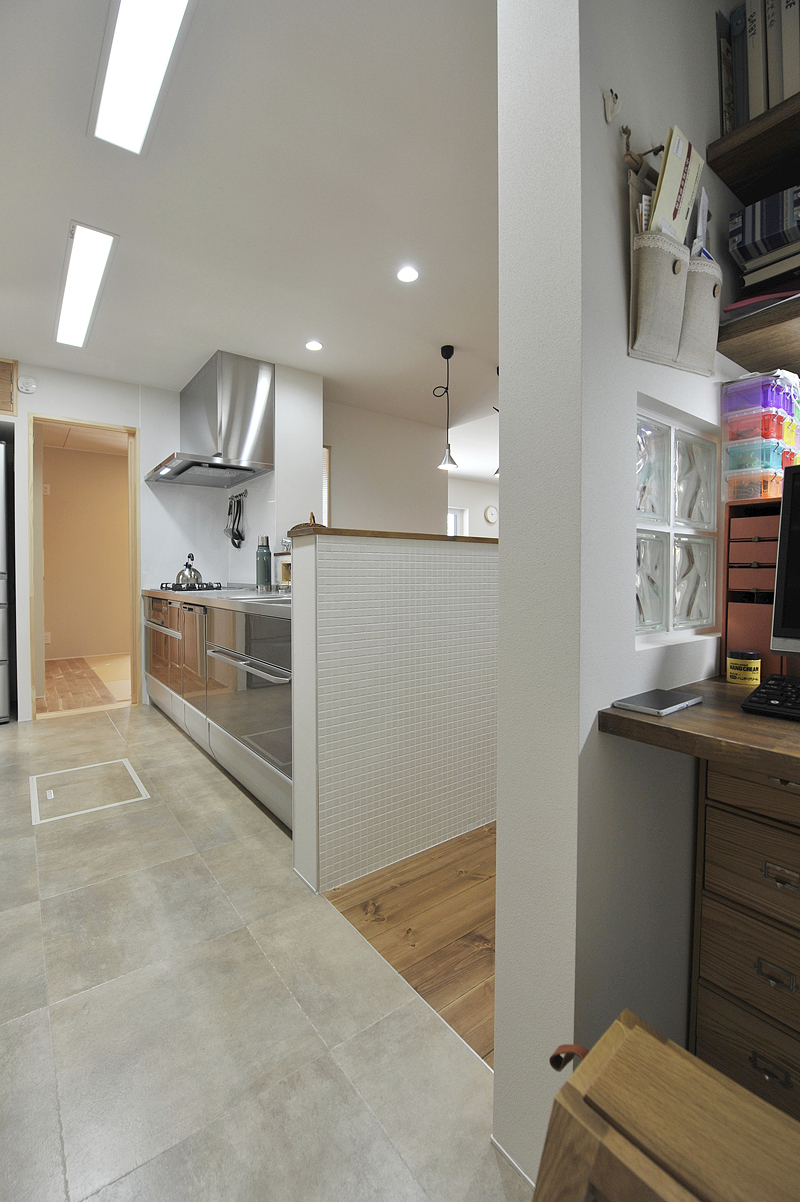 キッチンから見る回遊動線(左)。写真左手奥が和室となり、キッチンを通ってダイニング→リビングと回遊していきます。キッチン脇には奥さまの書斎スペースを作り、学校からの連絡や書類などをきっちり仕分け。リビングから見えないので、生活感が見えにくく、全体がスッキリしました。また、玄関からダイニングに入る扉は南仏の建築を思わせるペールブルー(右)。空間をぎゅっと引き締めます。