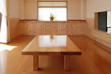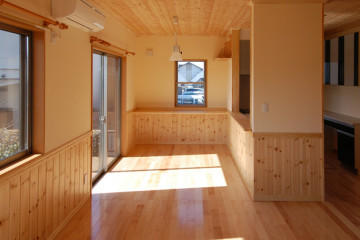 22畳のリビングはあつ密すぎフローリングと杉羽目板の壁。
