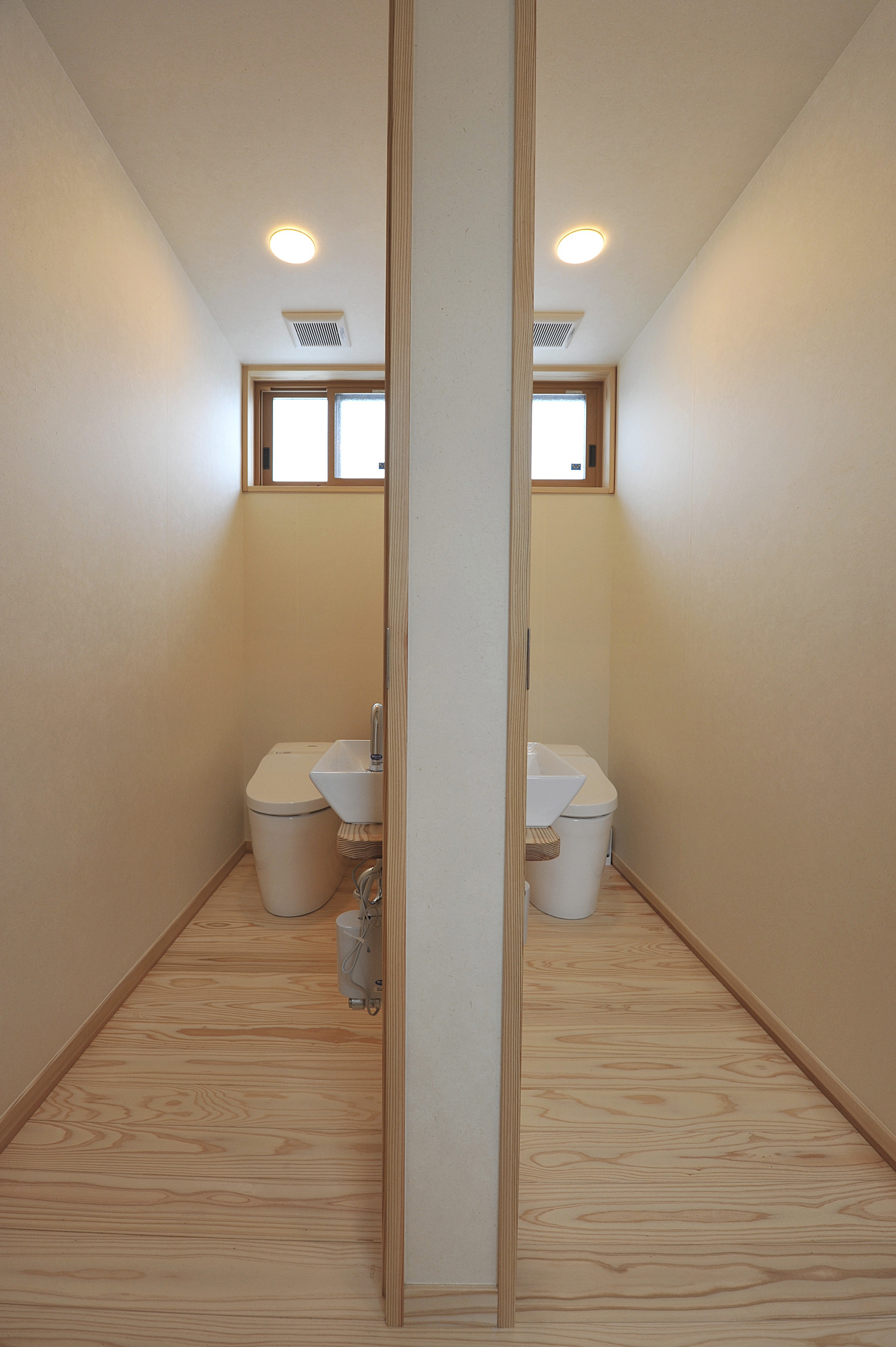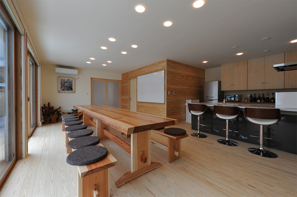 22畳あるLDKが建物の中心で、木がふんだんに使われているのがひと目で感じられます。外国の方は日本の木の文化に関心が深く、桧や杉をとても日本的だと感じています。この建物にはあつ密すぎフローリング、杉壁板、杉の一枚板テーブルとベンチなど実際に体に触れる部分に木を多用し、肌で感じて頂けるようになっています。