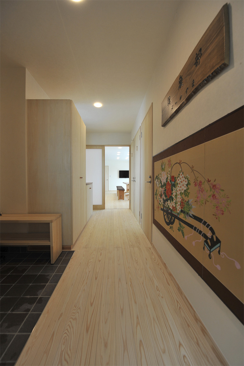 玄関には建主様が選んだ日本画と直筆の木製看板をあしらっています。