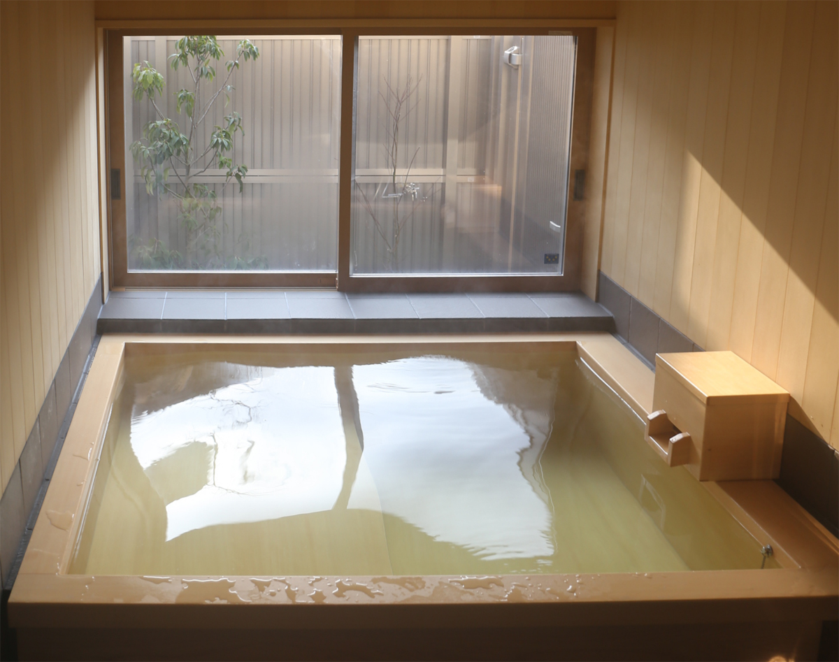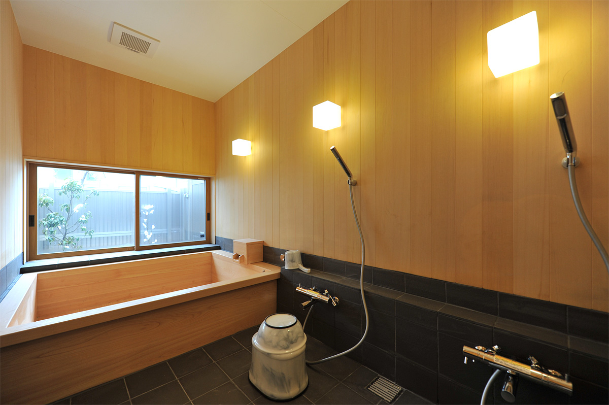 さらに、湯本ならではのお楽しみと言える温泉も引いており、大きな浴室をしつらえました。岐阜から取り寄せた汚れにくい加工を施した特注の檜風呂は、ゆったりと入浴することが出来、温泉風情が楽しめます。