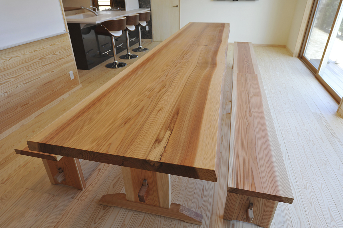 長さ約4メートルの杉の一枚板のテーブルは一度に16人座ることが出来ます。