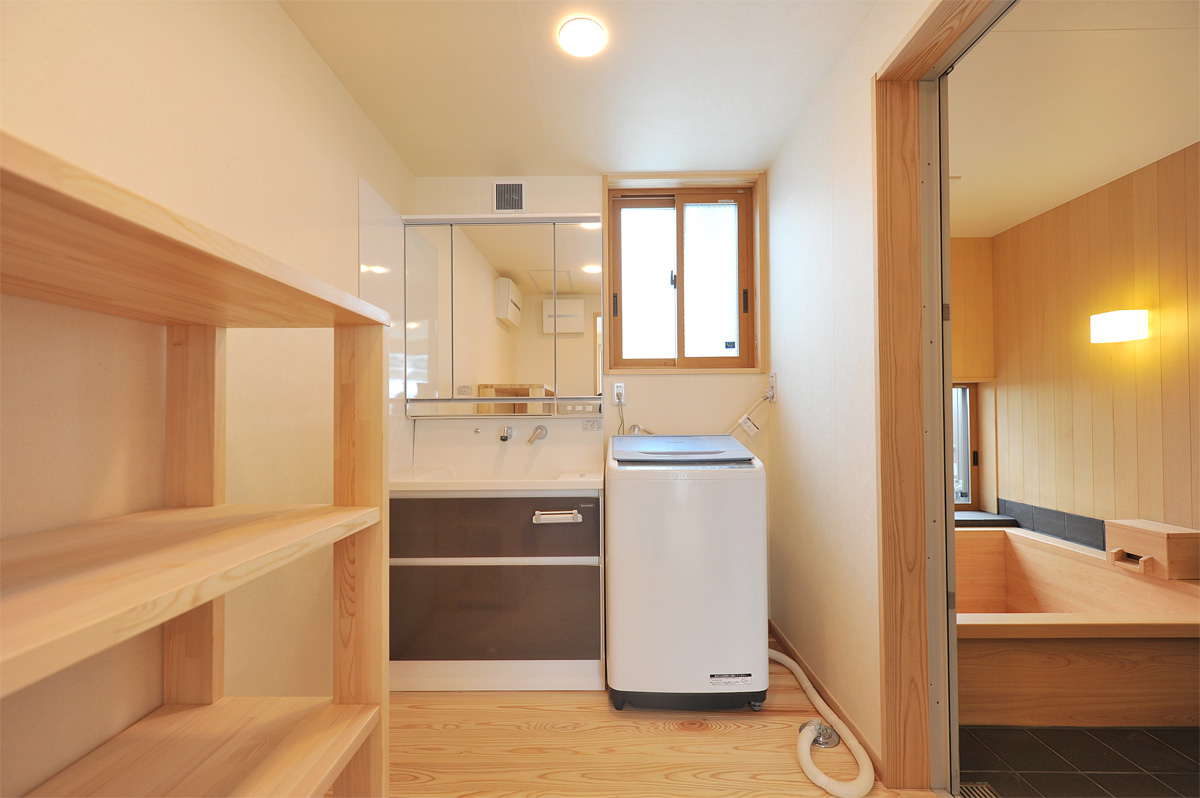 洗面脱衣所には銭湯風に脱衣台。