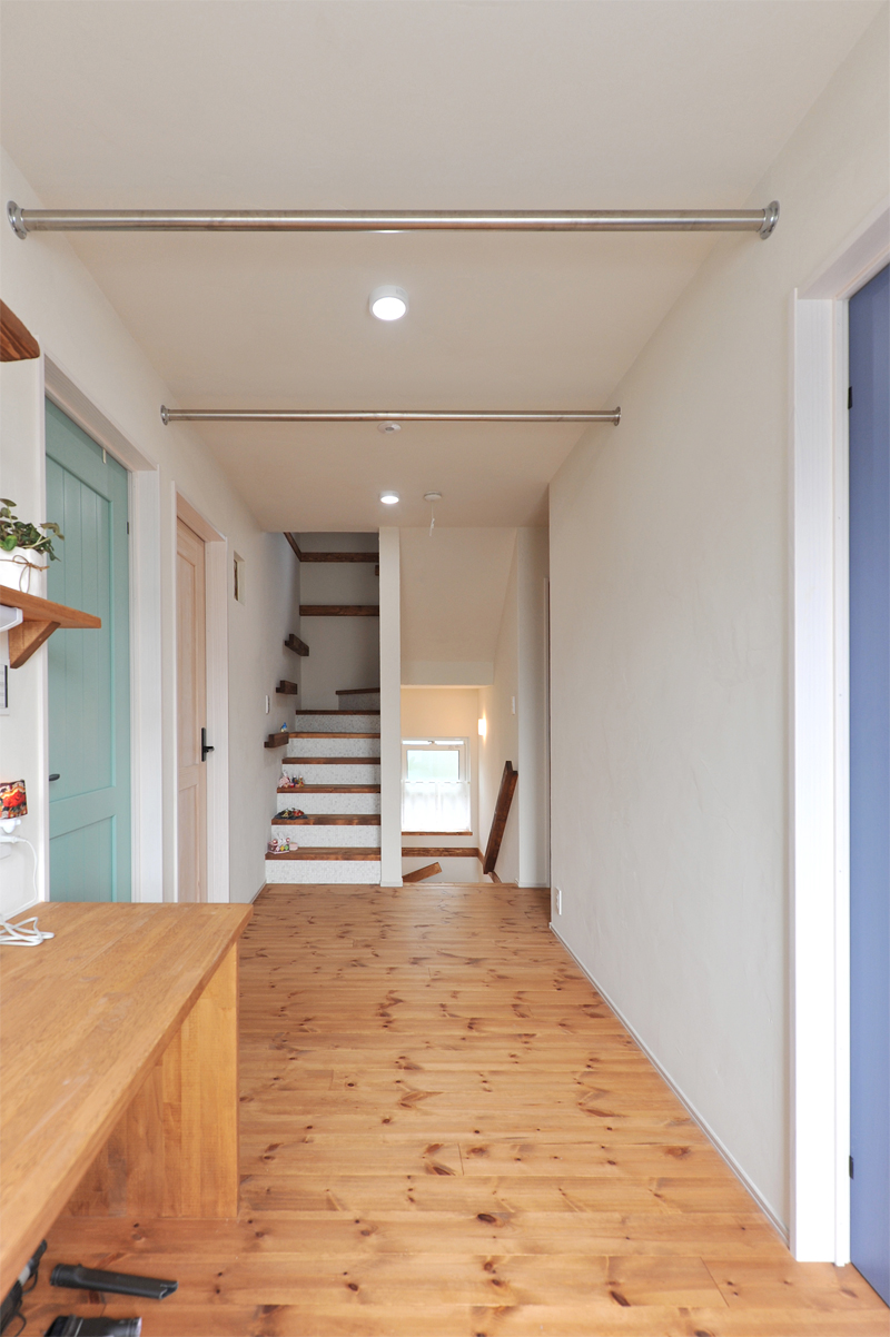 2階のフリースペースは洗濯用バーが3本並んでいて、大容量の部屋干し可能。