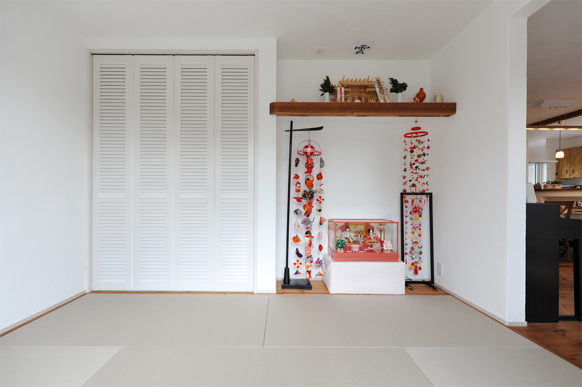 リビングから続く和室は和紙畳で「桜灰」というなんとも繊細なピンクグレー。