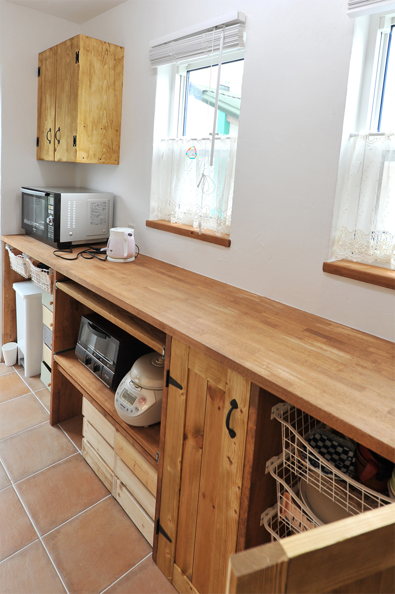 19キッチン作業台は使いやすいよう収納も考えて造り付け。スペイン製のテラコッタタイル貼。