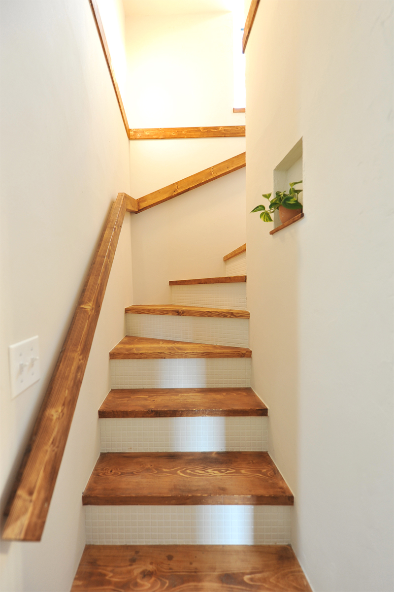 階段の蹴上げはなんとタイル張り。「自然派で小さくてかわいい家」がご希望だった奥様のこだわりポイント。