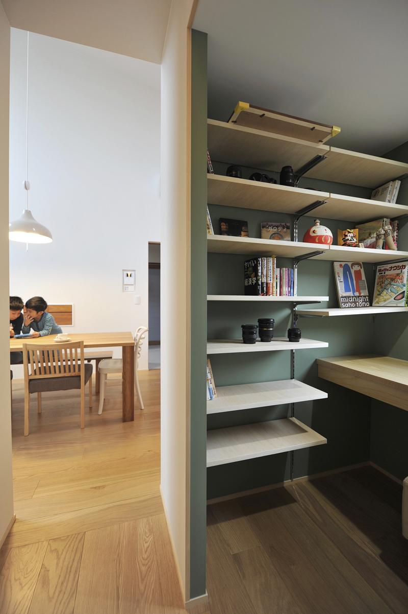 右手はご主人用の小部屋。左右に棚を設置し中央に机。小さいながら全てに手が届く便利さ。